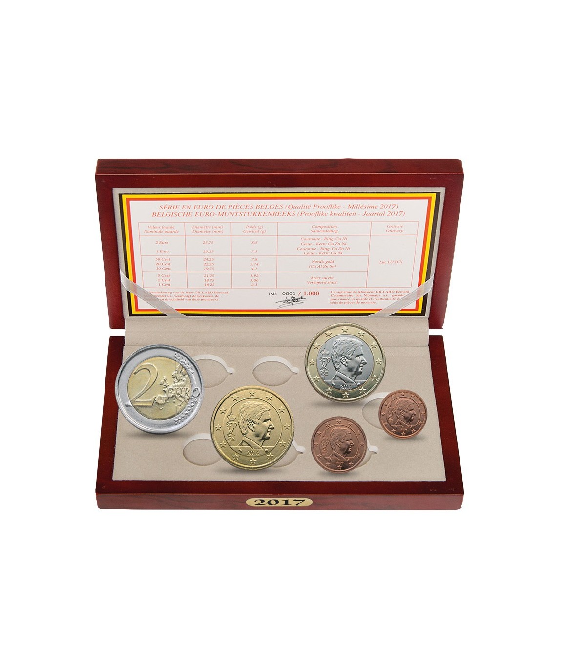Serie in der offiziellen Geschenkbox Belle Epreuve BE Belgique 2017 mit allen 8 Münzen von 1 Cent bis 2 Euro in einer Holzbox.