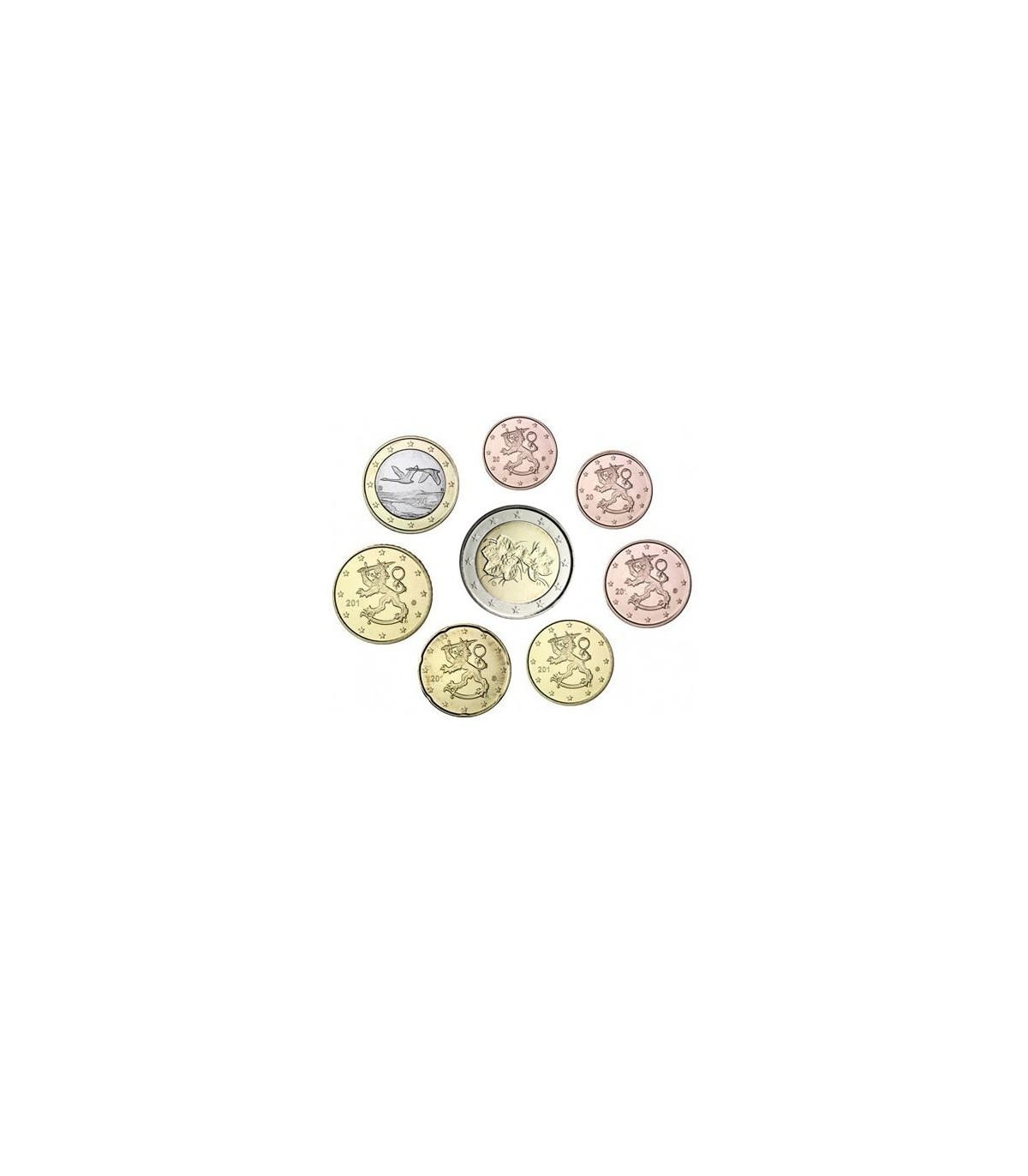 Eine Serie von 8 Münzen, die den 1 Cent bis 2 Euro Finnland 2018 vereint, einschließlich der 1€ und 2€ Münzen.