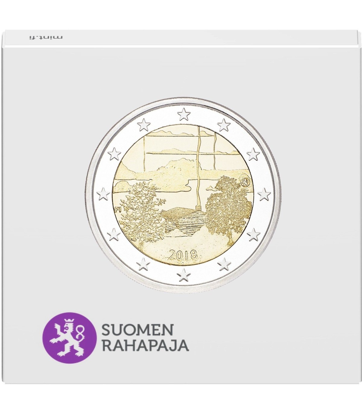 Die Zeichnung zeigt eine finnische Landschaft mit einer typischen finnischen Sauna an einem See in der Mitte. Das Ausgabejahr "2018" ist unten in der Mitte angegeben. Das Ausgabeland "FI" ist in der Mitte links und das Münzzeichen in der Mitte rechts angegeben.