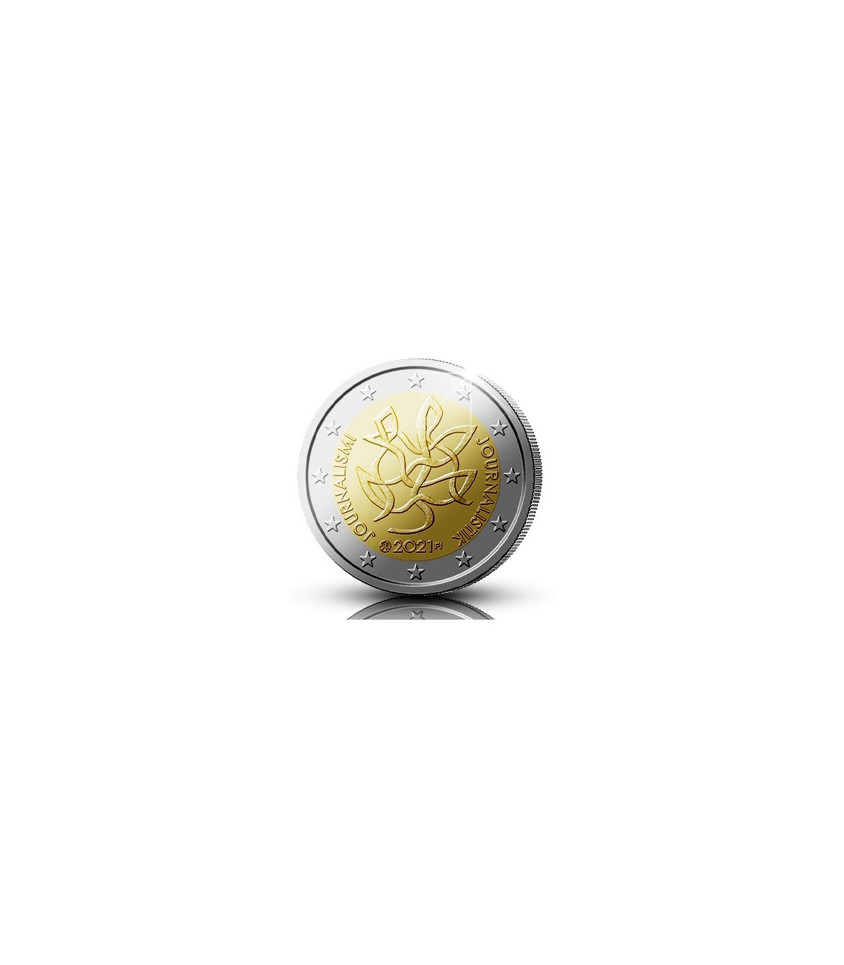 Beschreibung des Münzbildes: Die Figuren auf der Innenseite der Münze können als stilisierte menschliche Silhouetten interpretiert werden, die aus Bändern bestehen, die zu einem Netz verwoben sind. Der Rand der Innenseite der Münze trägt die Aufschrift "JOURNALISMI JOURNALISTIK". Der untere Rand des Münzinneren trägt die Aufschrift "2021 FI", davor das Münzzeichen der finnischen Münzprägeanstalt.