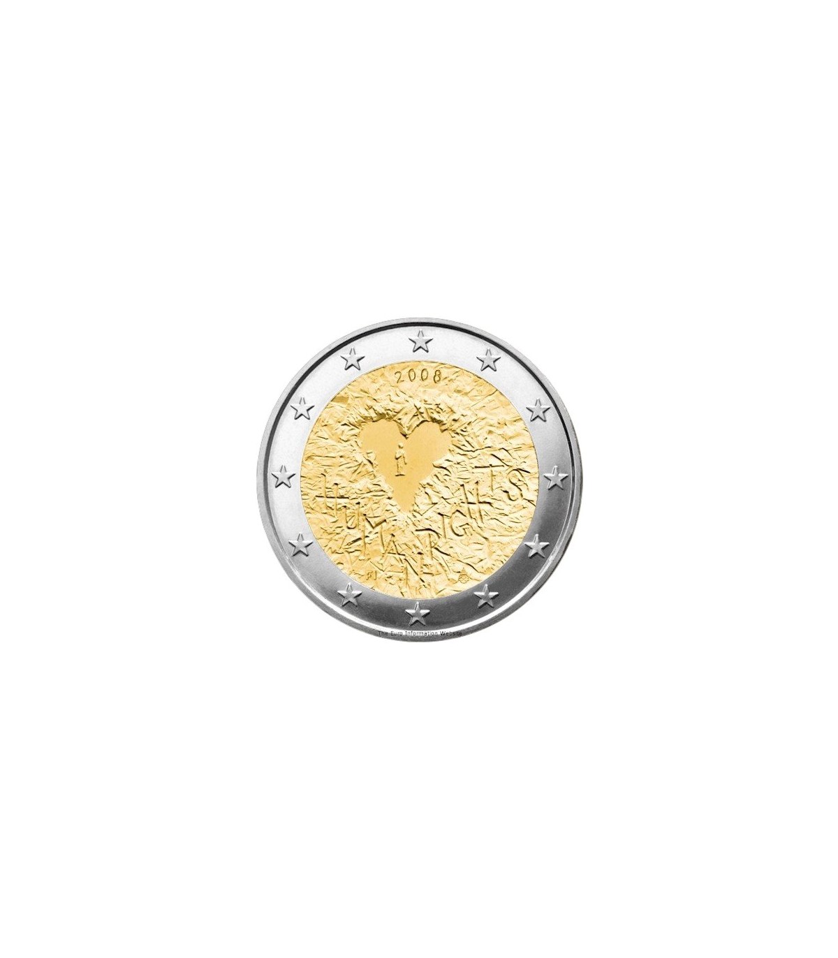 Finnland anlässlich des 60. Jahrestags der Allgemeinen Erklärung der Menschenrechte. Der innere Teil der Münze zeigt eine menschliche Silhouette, die durch eine herzförmige Öffnung in einer Steinmauer zu sehen ist. Unterhalb des Herzens ist der Text HUMAN RIGHTS zu lesen. Über dem Herzen ist die Jahreszahl 2008 eingeprägt. Die Angabe des Ausgabelandes FI, der Buchstabe K, (Initiale des Künstlers Tapio Kettunen) und das Münzzeichen erscheinen am unteren Rand des Münzbildes. 1.500.000 ausgegebene Münzen