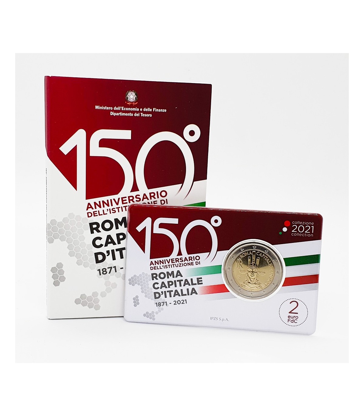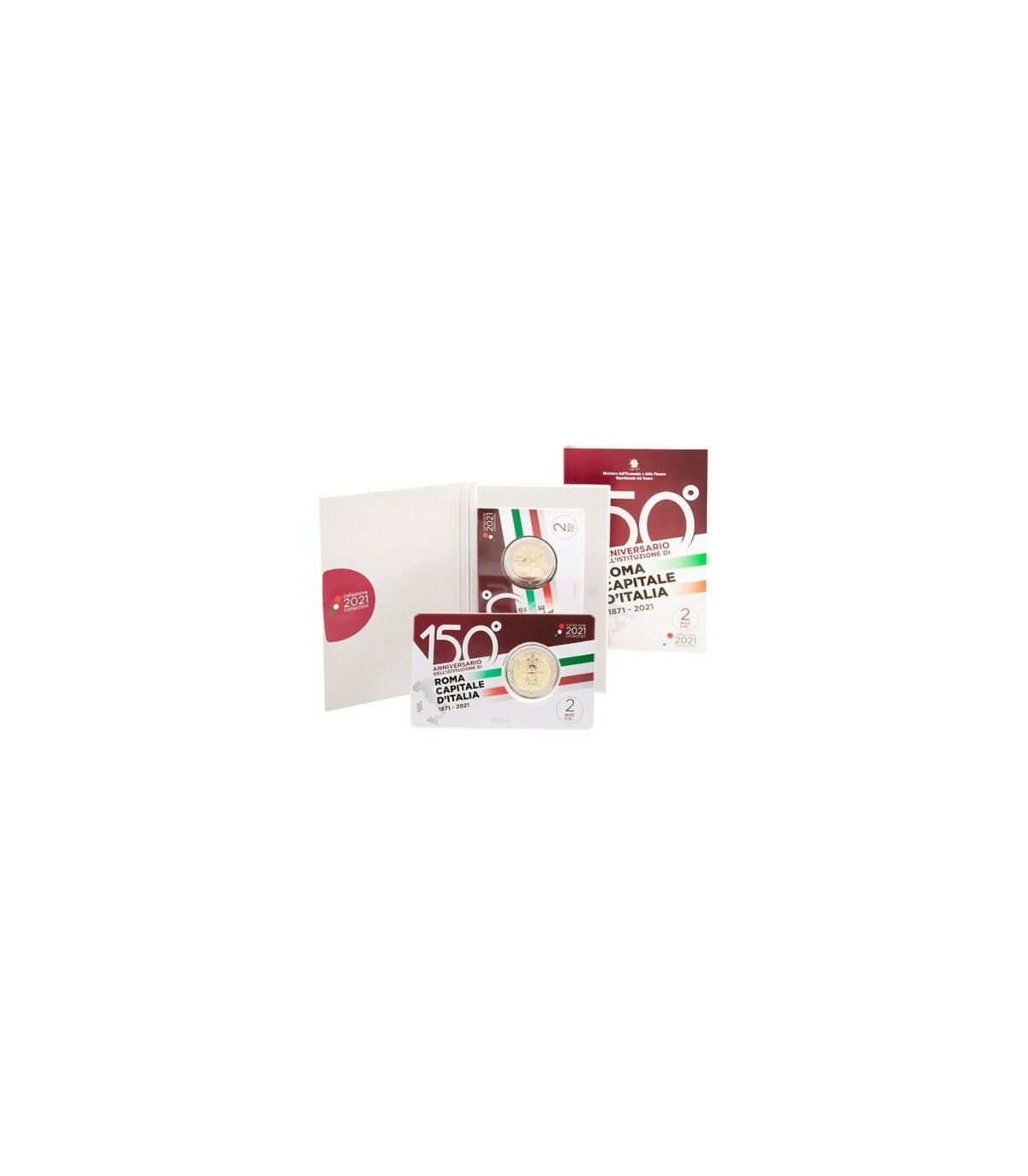 Das Design zeigt die Büste der Dea Roma, einer Skulptur von Angelo Zanelli, die in der Mitte des großen Votivaltars Altare della Patria steht, der der italienischen Nation gewidmet ist und sich im Vittoriano-Komplex in Rom befindet. Die Legende "ROMA CAPITALE" erscheint auf der Oberseite, die Jahreszahlen "- 1871- 2021-" (das Jahr, in dem Rom zur Hauptstadt Italiens erklärt wurde, und das Jahr, in dem die Münze ausgegeben wurde) auf der rechten Seite, das Zeichen der Italienischen Republik "RI" und das Zeichen der Münzstätte Rom "R" auf der linken Seite und die Initialen der Künstlerin Uliana Pernazza "UP" auf der Vorderseite.