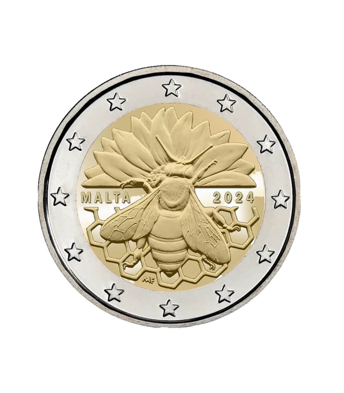 Auf der Innenseite der Münze befindet sich eine Zeichnung, die die Malteserbiene darstellt, eine auf der Insel endemische Art, die sich durch ihre schwarze Färbung auszeichnet. Morphologisch ähnelt sie der Sizilianischen Biene und der Tellianischen Biene, und diese drei Unterarten teilen eine genetische Nähe. Diese Ähnlichkeit lässt sich durch die Besiedlung Maltas und Siziliens durch afrikanische Bienen während der Eiszeit erklären, als der Meeresspiegel des Mittelmeers viel niedriger war. Das Motiv enthält außerdem eine Blume, die gerade von einer Biene bestäubt wird, sowie Bienenstockwaben. Der Name des Ausgabestaats und die Jahreszahl "2024" sind an den Seiten zu lesen, unten stehen die Initialen des Graveurkünstlers.