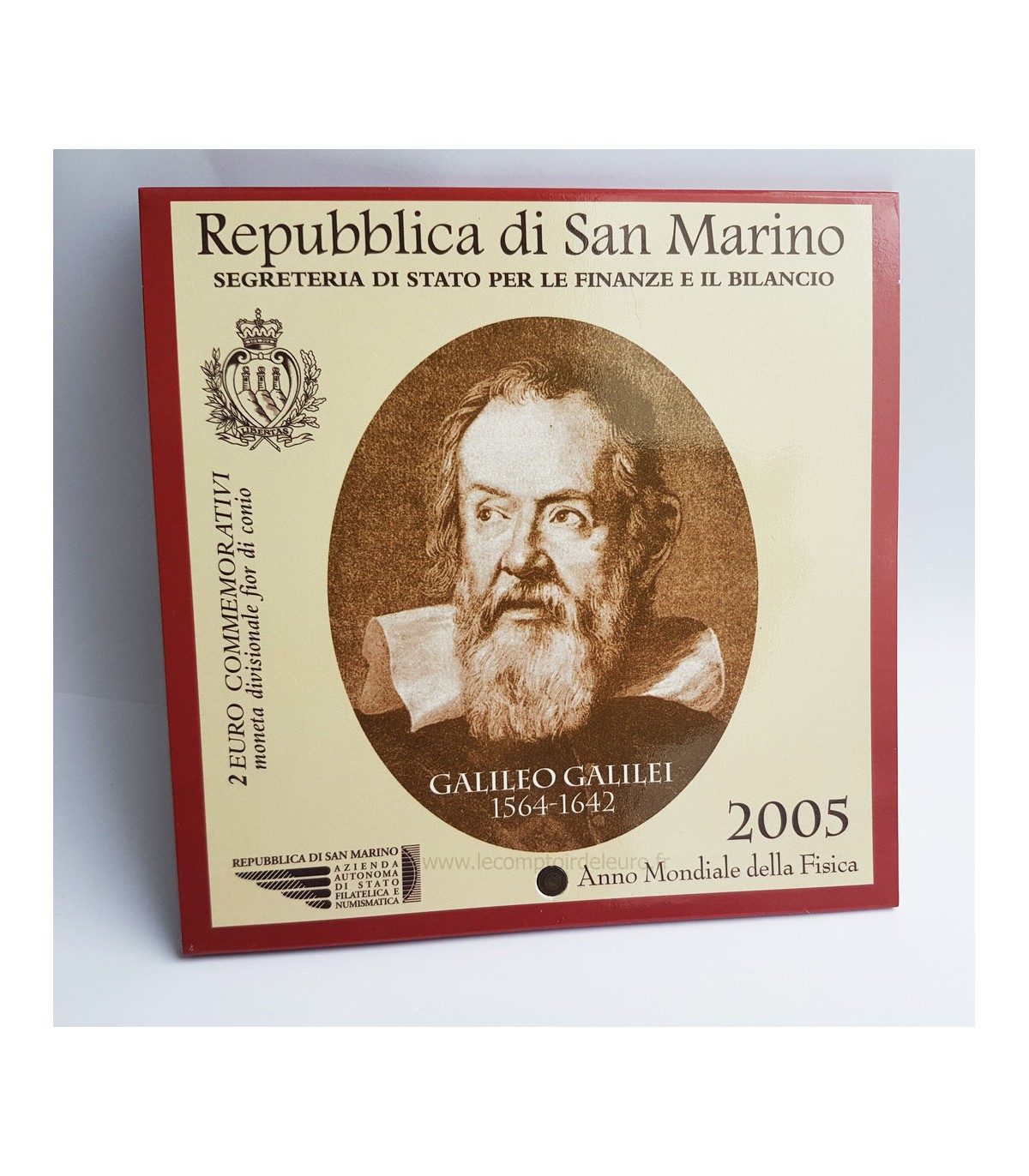 Beschreibung des Designs: Der innere Teil der Münze zeigt eine freie Interpretation von Galileos allegorischem Gemälde "La fisica antica" oder das Studium der Planeten. Die Jahreszahl erscheint unter einem Globus, der auf einem Schreibtisch steht. Auf der linken Seite des Bildes befindet sich das Werkstattzeichen "R" und auf der rechten Seite sind die Initialen des Graveurs "LDS" abgebildet. Die Worte "SAN MARINO" bilden einen Halbkreis über dem Bild, und die Worte "ANNO MONDIALE DELLA FISICA" sind entlang des unteren Rands des inneren Münzrings zu lesen. Der äußere Ring enthält die zwölf Sterne der Europäischen Union. Die Sterne sind durch die äußeren Teile eines Bildes voneinander getrennt, das ein stilisiertes Atom darstellt, das die gesamte Münze bedeckt.