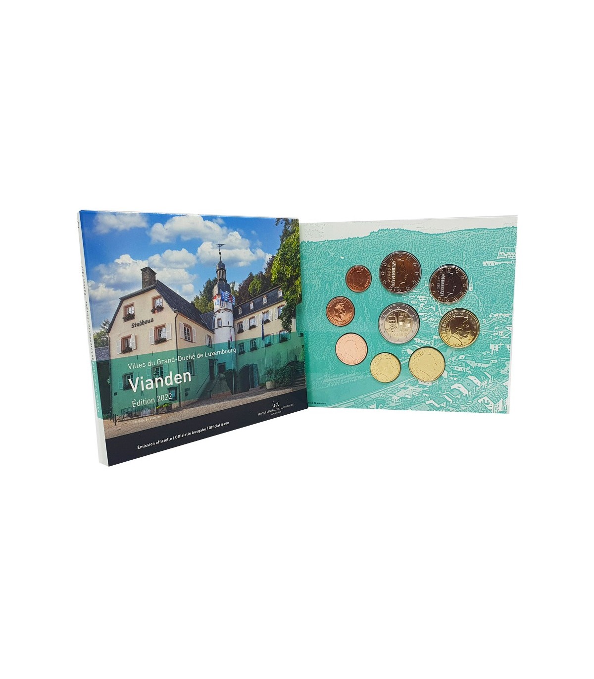 Box Universal Brillant Luxemburg 2022 mit den 8 Münzen des Jahres und der Gedenkmünze 50 Jahre Luxemburger Trikolore , d.h. 9 Münzen.