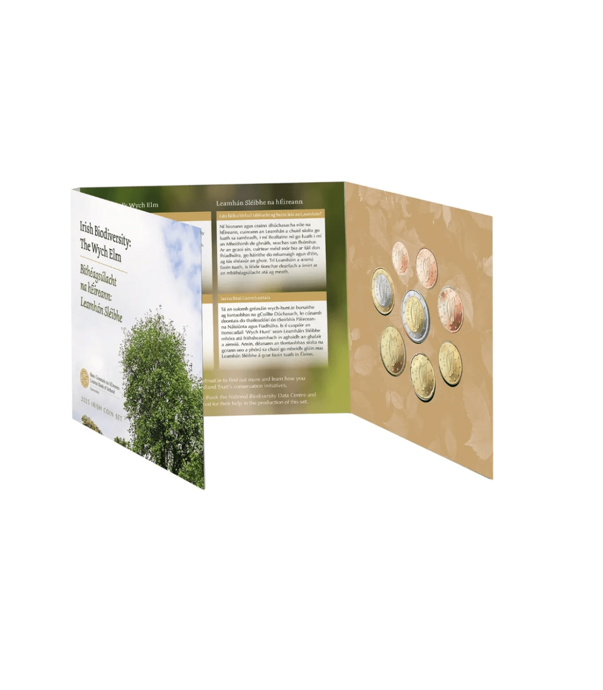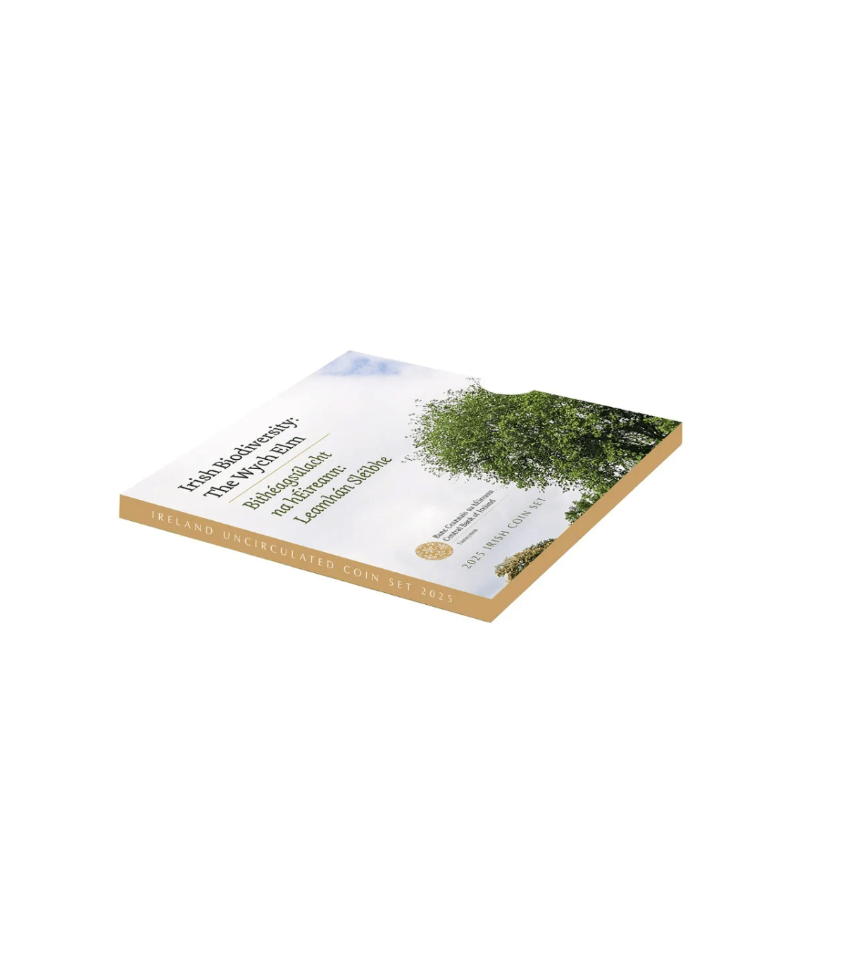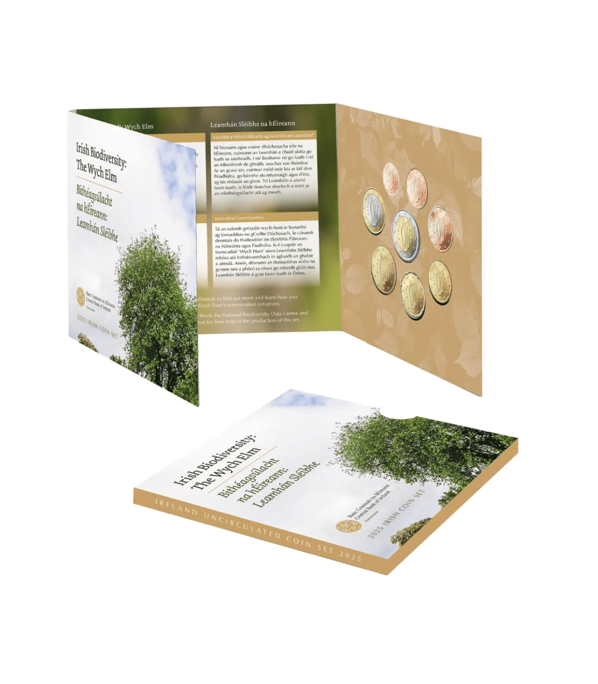 Das Set Universal Brillant (BU) Irland 2025 stellt die Wych-Ulme, einen symbolträchtigen Baum der irischen Biodiversität, in den Mittelpunkt. Es enthält alle acht Euro-Münzen des Jahrgangs 2025, von 1 Cent bis 2 Euro, die alle in BU-Qualität mit einer auf 5.000 Exemplare limitierten Auflage geprägt wurden,