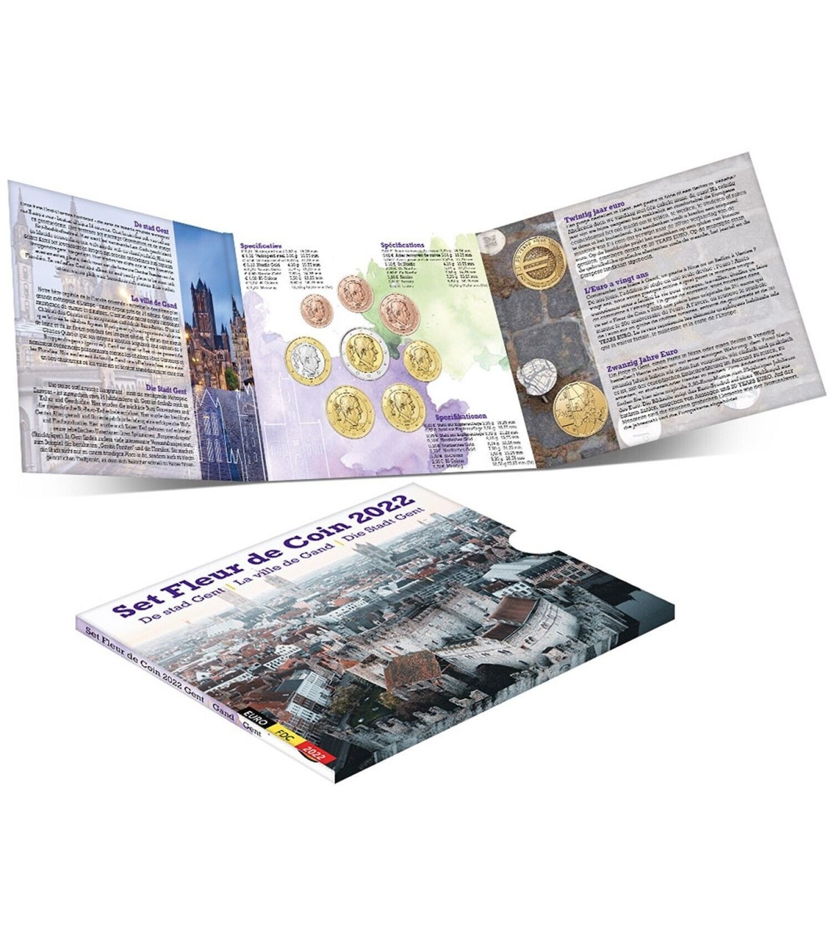 Nachdem die vorherigen Fleur de Coin-Sets den großen belgischen Städten Brüssel, Antwerpen und Lüttich gewidmet waren, steht heute die Stadt Gent im Mittelpunkt. Diese stolze, fast 14 Jahrhunderte alte Hauptstadt von Ostflandern ist reich an Kultur und Geschichte. Hier stehen das Grafenschloss sowie die St.-Bavo-Kathedrale, die das berühmte Altarbild Das mystische Lamm beherbergt. Die Stadt war jahrhundertelang eine Hochburg der Textilindustrie und war Geburtsort von Jacob van Artevelde und dem mächtigen Karl V.. Sie ist auch Schauplatz zahlreicher Vergnügungen, wie den berühmten Genter Festen und den Floralien. All das und noch viel mehr macht Gent zu einem echten Place to be, an dem es sich gut leben lässt und an dem sich jeder sofort zu Hause fühlt.
