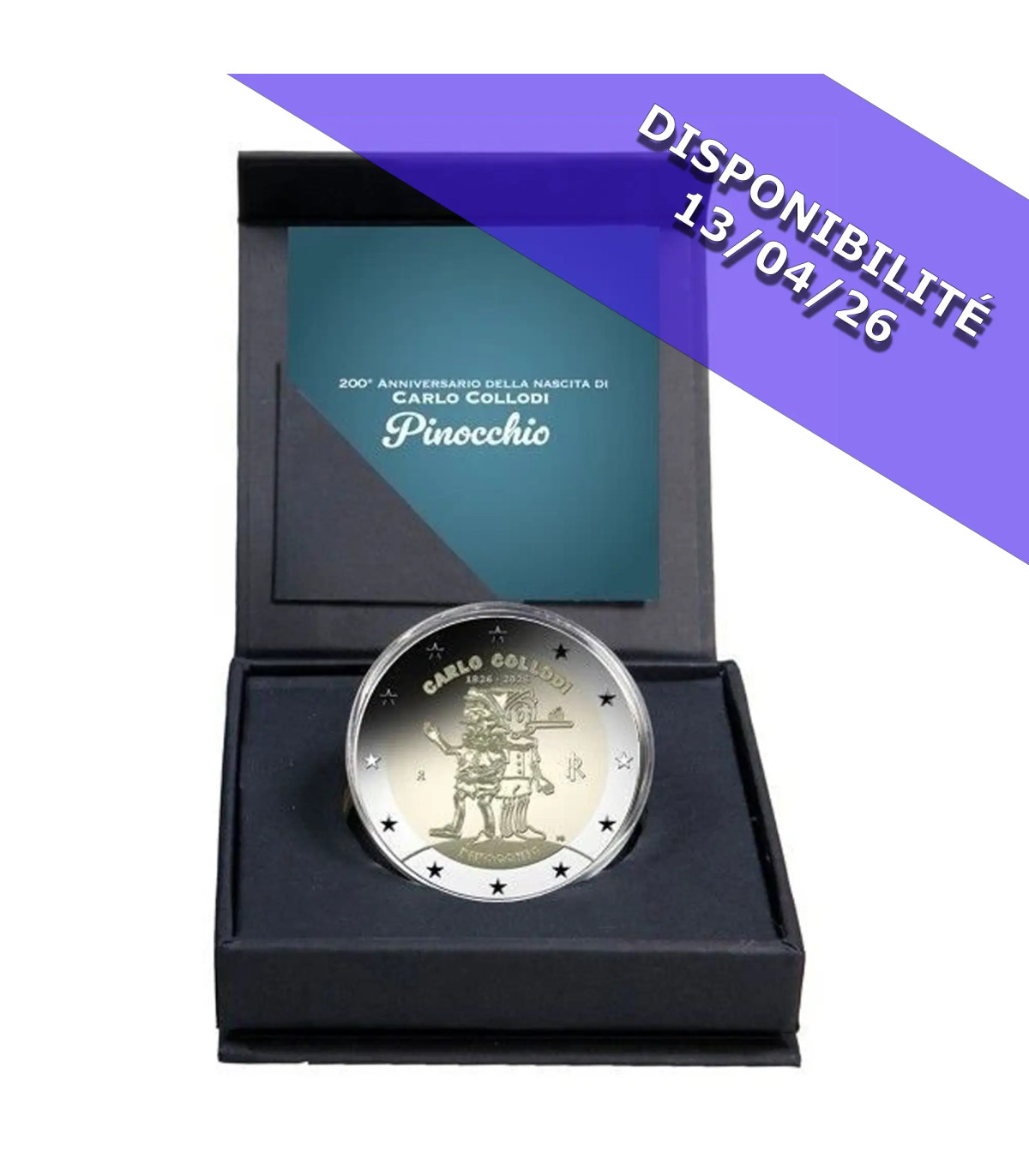 The obverse of the coin features Pinocchio, the iconic character created by Carlo Collodi in The Adventures of Pinocchio, depicted dancing in the center of the composition. On the right, his shadow shows a symbolic scene: the famous puppet watches in surprise as the talking Cricket (Jiminy Cricket), poised at the end of his nose, stretches out after telling a lie. At the top, the name CARLO COLLODI appears, along with the dates 1826 and 2026, recalling respectively the writer's birth and the year of the play's issue. On the left is the letter R, the mark of the Mint of Rome, while on the right is the monogram RI for Repubblica Italiana. At the bottom is PINOCCHIO, accompanied by the monogram MB, the artist's signature. The whole is surrounded by the twelve stars of the European Union.