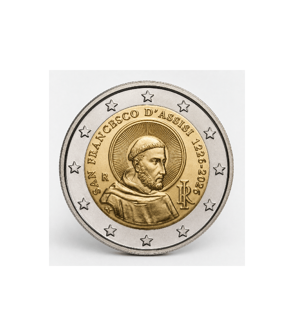 The 2 Euro Italy 2026 commemorative coin celebrates the 800th anniversary of the death of St. Francis of Assisi, one of the most important spiritual figures in Italian and European history. Founder of the Franciscan order, Saint Francis remains associated with strong values such as peace, humility, fraternity and respect for creation. The drawing at the center of the piece is inspired by a 14th-century fresco by Simone Martini, preserved in the Basilica of St. Francis in Assisi, Umbria. This artistic reference reinforces the link between the coin, Italian heritage and the memory of the saint. The inscription "SAN FRANCESCO D'ASSISI 1226-2026" at the top recalls both the year of his death and that of the commemorative issue. The lower part features the monogram "RI", representing the Italian Republic, and the letter "R", the mark of the Mint of Rome. With this issue, Italy pays tribute to a figure whose religious, cultural and humanist heritage continues to radiate far beyond Assisi.