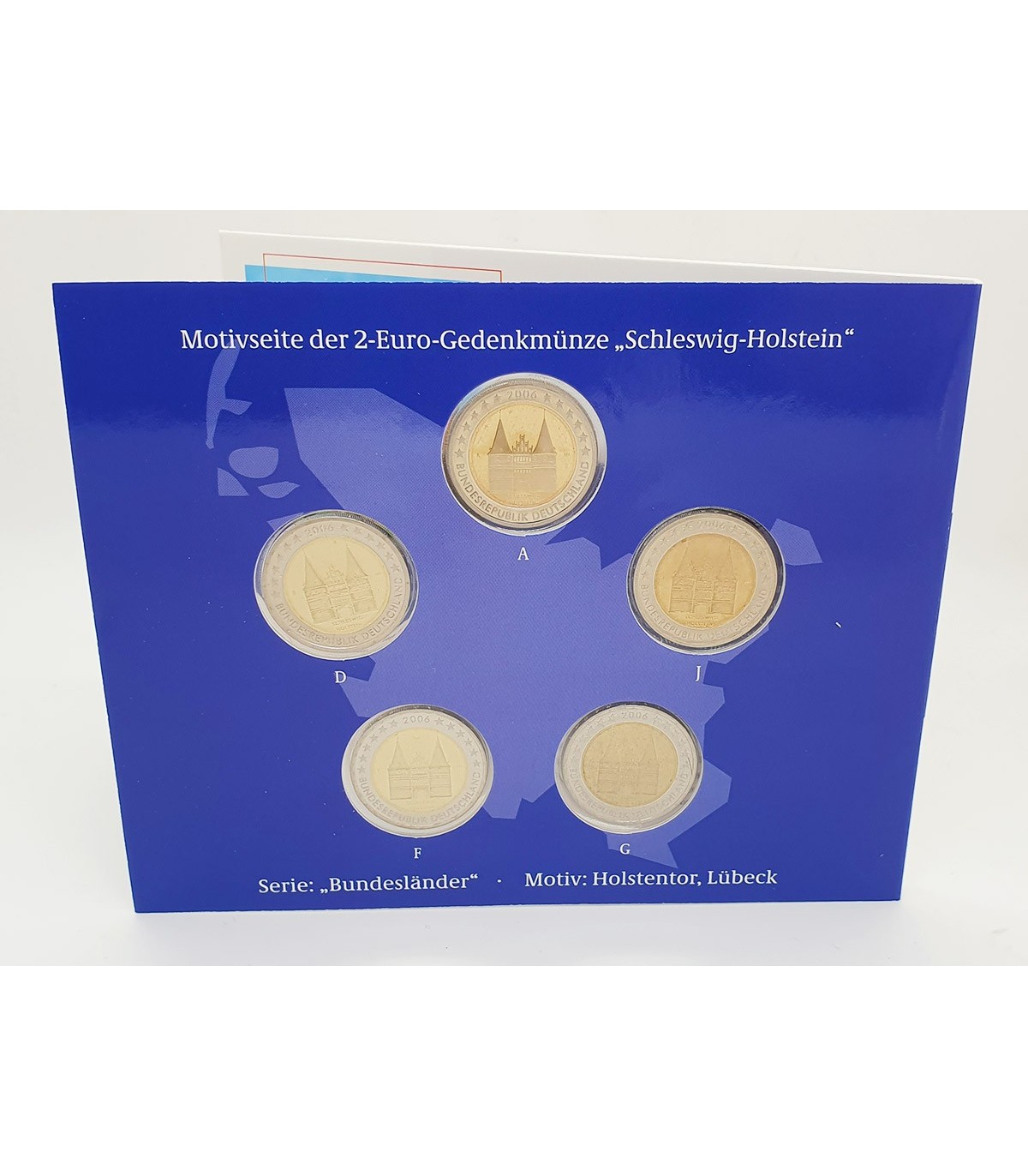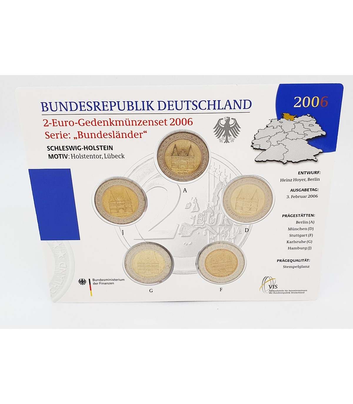 On the occasion of Schleswig-Holstein's presidency of theBundesrat, Germany issued its first commemorative 2 euro Länder coin in 2006. The inner part of the coin depicts the "Holstentor", the emblematic gateway to the city of Lübeck. The words SCHLESWIG-HOLSTEIN appear at the bottom of the inner part and below the door. The initials of engraver Heinz Hoyer, HH, appear to the right of the design. One of the letters A (Berlin), D (Munich), F (Stuttgart), G (Karlsruhe) or J (Hamburg) appears on the left of the design as a workshop mark. Twelve stars form a semicircle at the top of the outer ring, interrupted by the year 2006 at the top of the coin. The words BUNDESREPUBLIK DEUTSCHLAND form a semi-circle on the lower part of the outer ring. Edge lettering: EINIGKEIT UND RECHT UND FREIHEIT and the federal eagle.