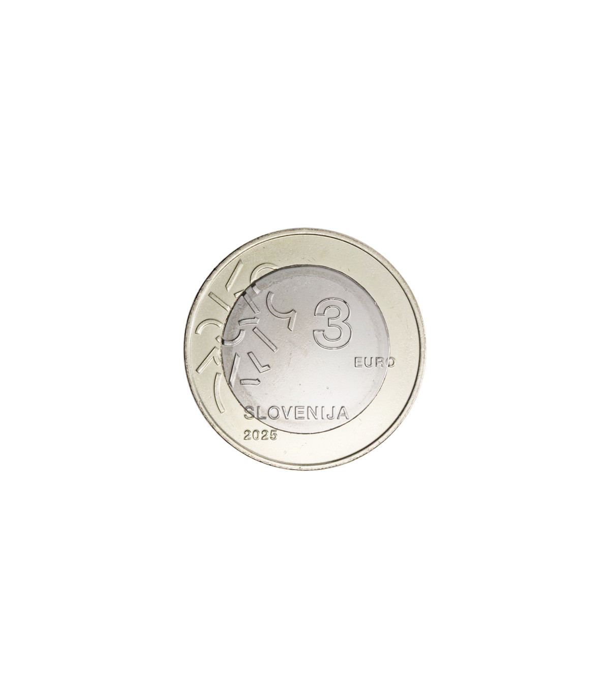 The reverse features a sober, contemporary design with the official references: the name of the issuing country "Slovenija", the face value "3 euro" and the year "2025". The whole highlights the importance of the event, while underlining the currency's European vocation.
