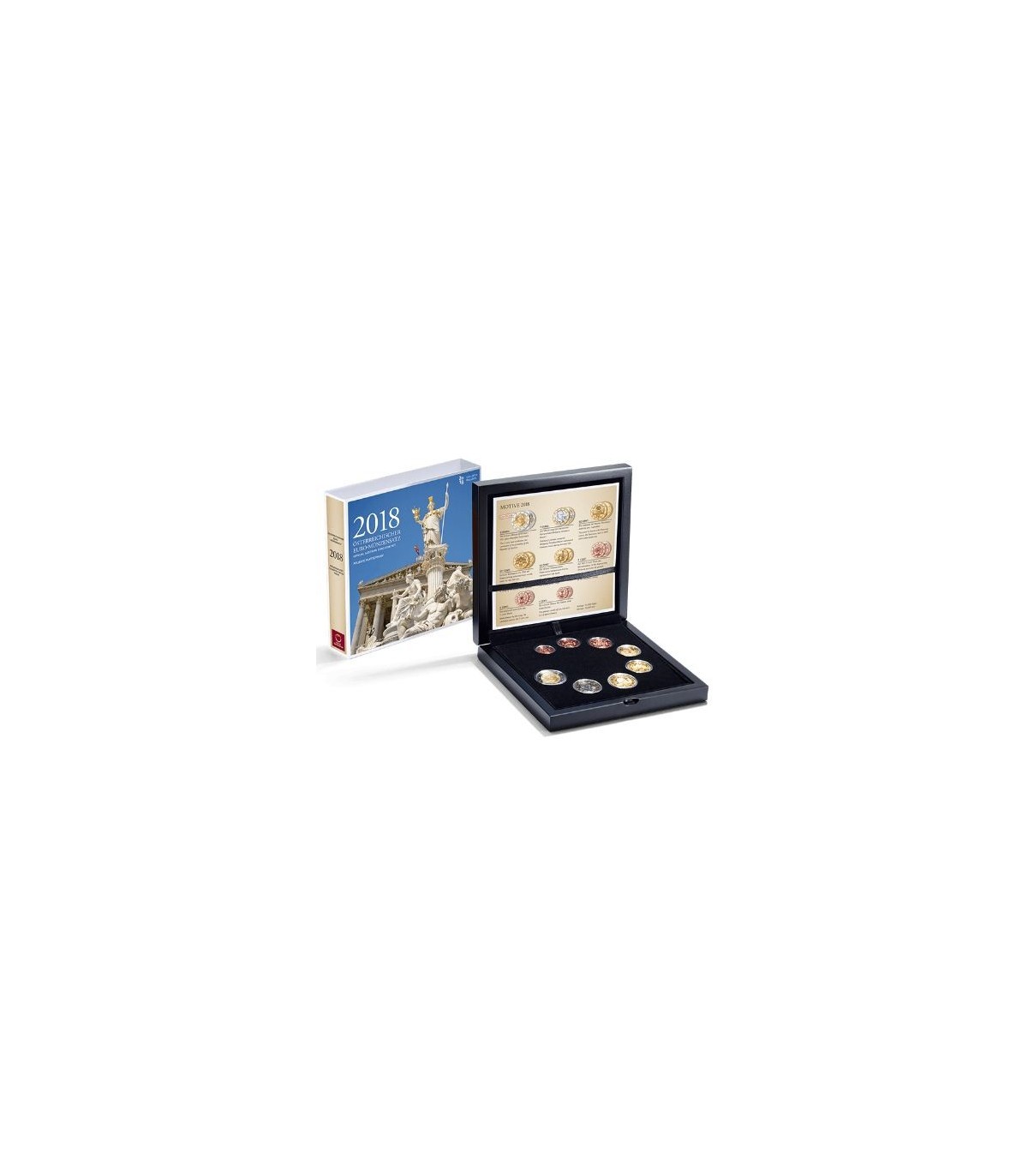 Austria series in a fine proof boxed set including the 8 coins from 1c to 1€ in the 2018 vintage + 2 Euro Austria 2018 commemorative coin on the theme of the Hundredth Anniversary of the Austrian Republic.