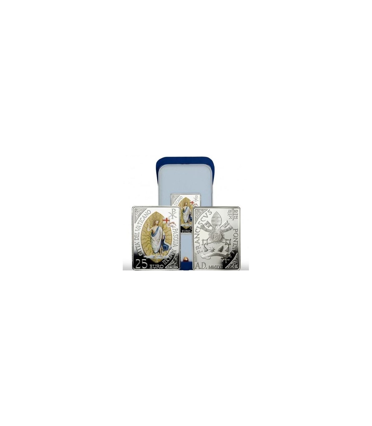 This year, for the first time, the Vatican Mint dedicates the rectangular silver-colored 25 euro coin to the solemnity of Easter. The detail of the risen Christ depicted on the coin is taken from Pinturicchio's fresco "The Resurrection", found in the Borgia Apartment in the Vatican Museums. Artist Antonella Napolione has reproduced the image of Christ blessing, enveloped in an oval of golden light rising above the tomb. The banner with the red cross on a white background, seen to the left of Jesus, is the symbol of the resurrection and in Christian iconography represents Jesus' triumph over death.