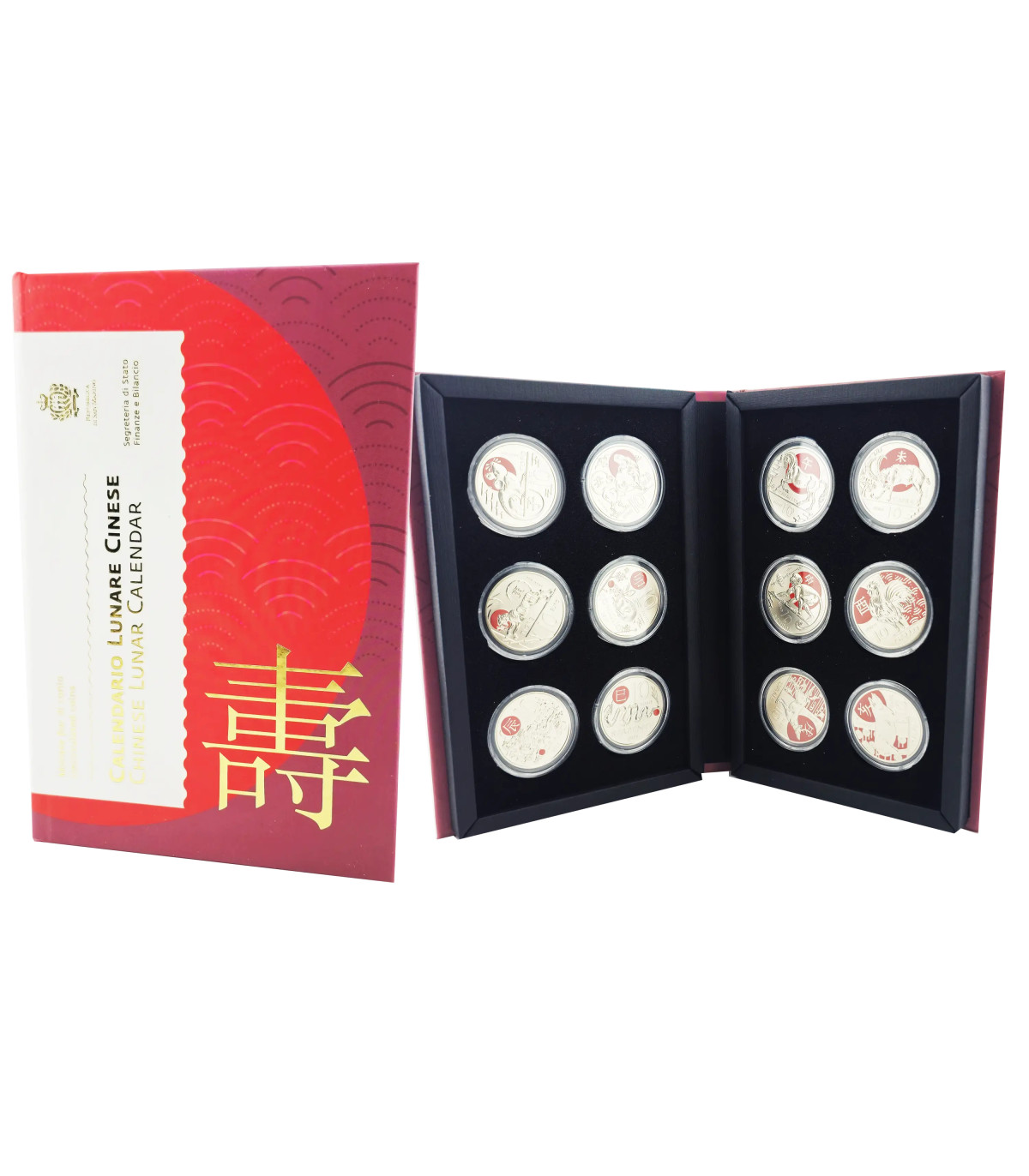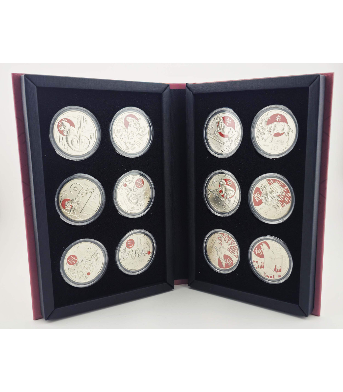 Complete collection of 12 commemorative 10-euro color coins issued by San Marino, dedicated to the signs of the Chinese zodiac, in UNC quality, presented in a boxed set, ideal for collectors with a passion for culture and astrology.