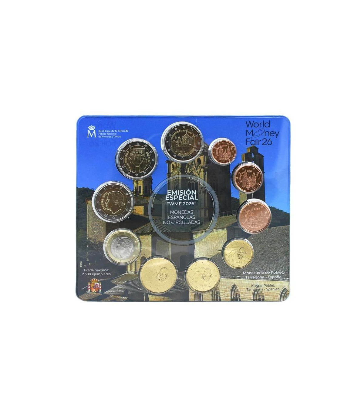 BU Spain 2025 boxed set of 9 coins including 8 circulating coins from 1 cent to 2 euros Spain of the year 2026 and the two commemorative 2 euro coins dedicated to the Poblet monastery and article 49 - Inclusion.