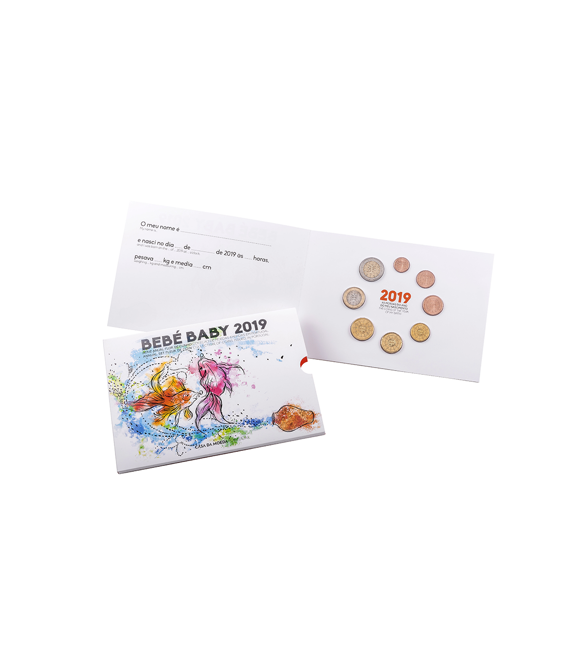 Annual birth gift set featuring the 8 Portuguese coins from 1 cent to 2 euros for 2019 in universal gloss quality.