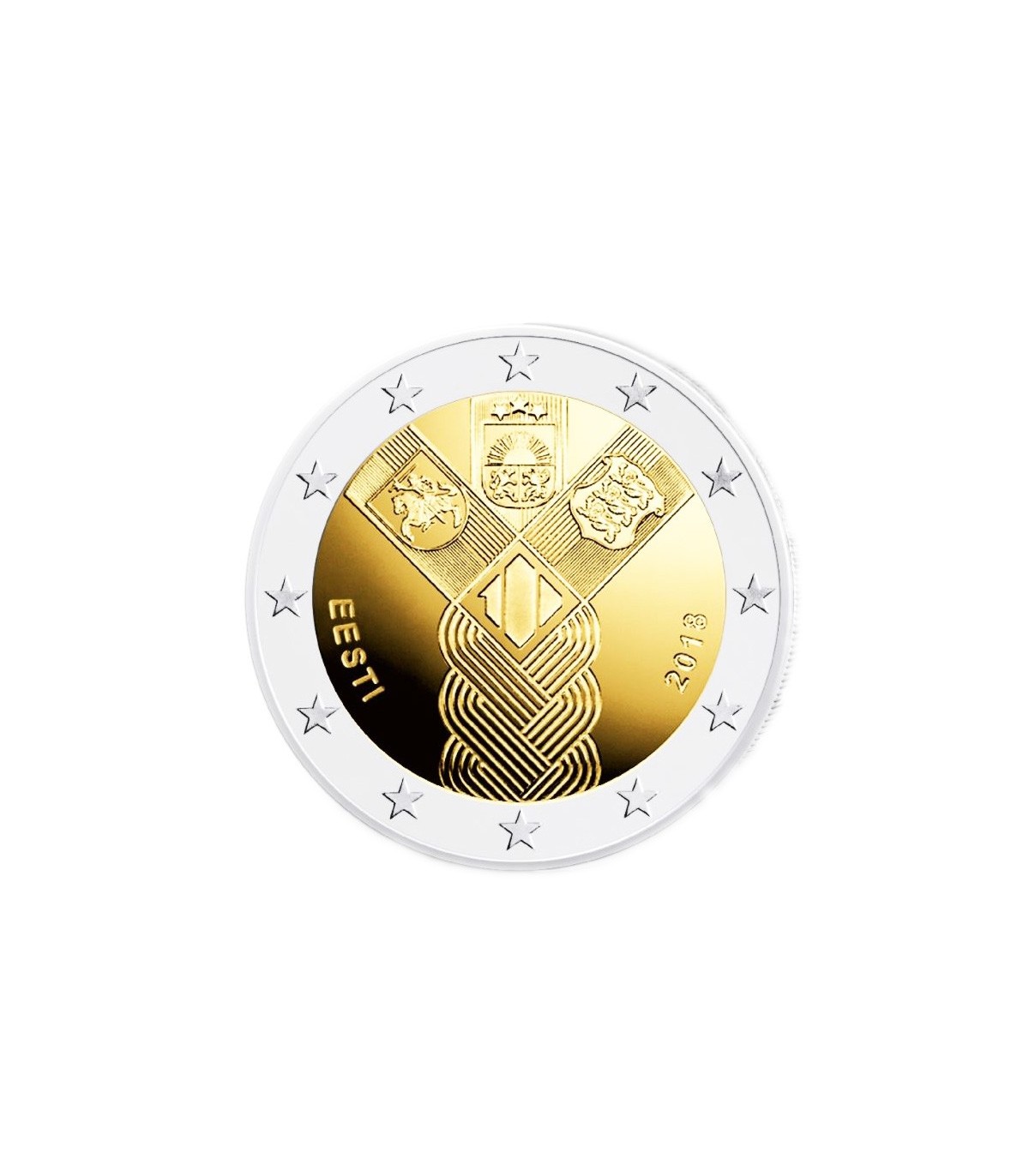 Los tres Estados bálticos están simbólicamente representados por una trenza. Están unidos por su historia y por un pasado, un presente y un futuro comunes. Un número estilizado ilustra el centenario, y también están representados los símbolos heráldicos de los tres Estados. El nombre del país emisor, "EESTI", figura en la parte izquierda de la moneda, y el año de emisión, "2018", en la parte derecha. El diseño fue elegido por el público de los tres países bálticos. El anillo exterior de la moneda representa las doce estrellas de la bandera europea.