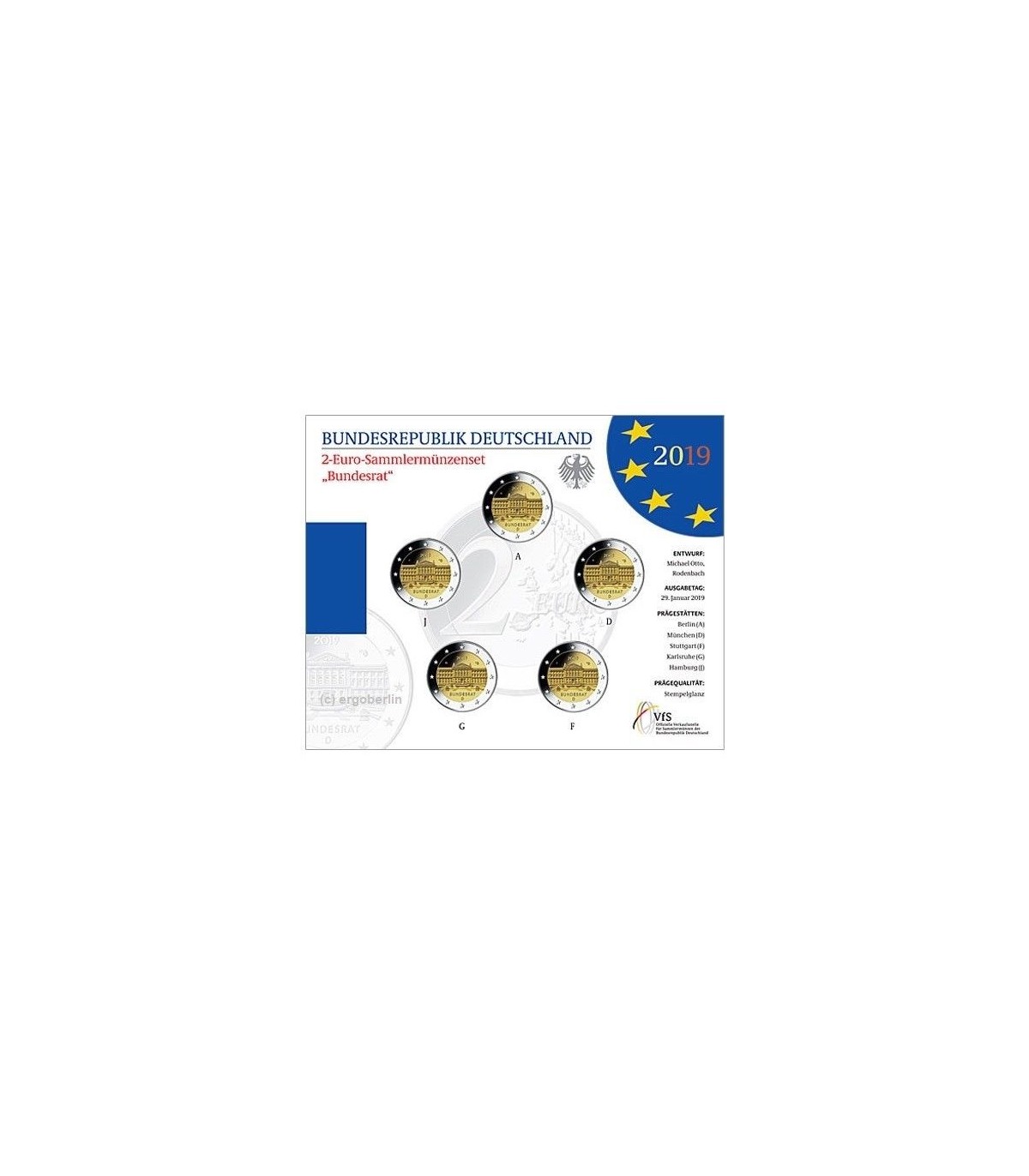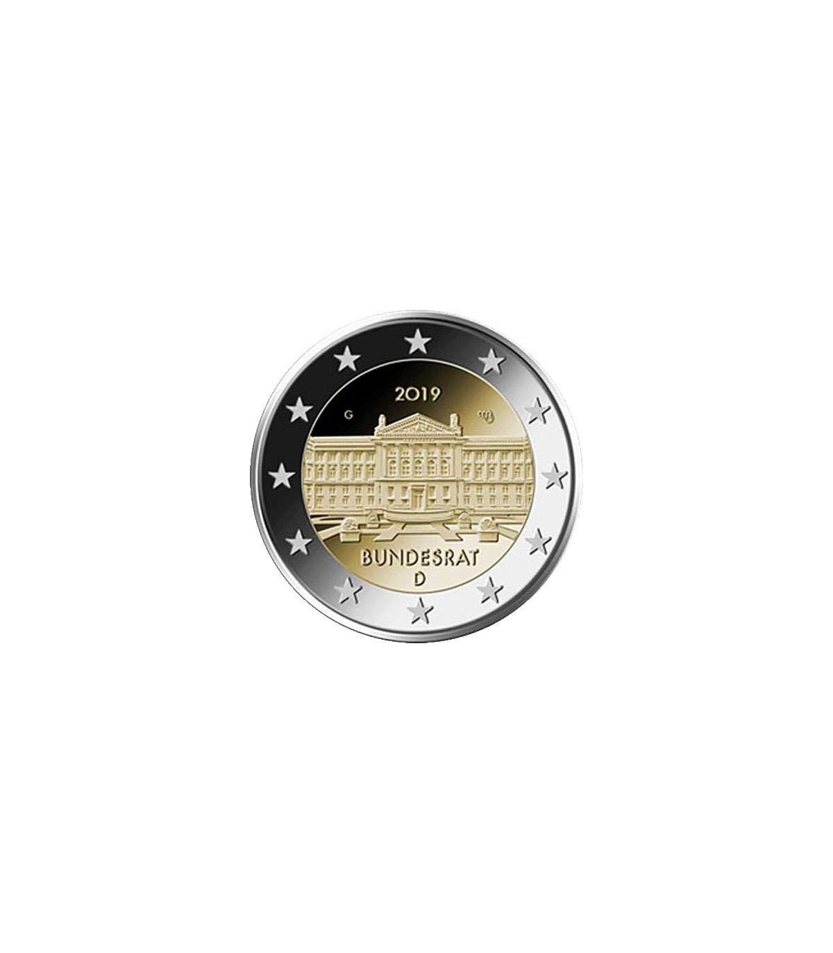 El diseño muestra una representación muy detallada y finamente tallada del edificio del Bundesrat. En la parte superior del interior de la moneda figura la marca de ceca correspondiente ("A", "D", "F", "G" o "J"), las iniciales del artista y el año "2019". La inscripción "BUNDESRAT" y el código del país emisor alemán "D" aparecen en el interior de la moneda.