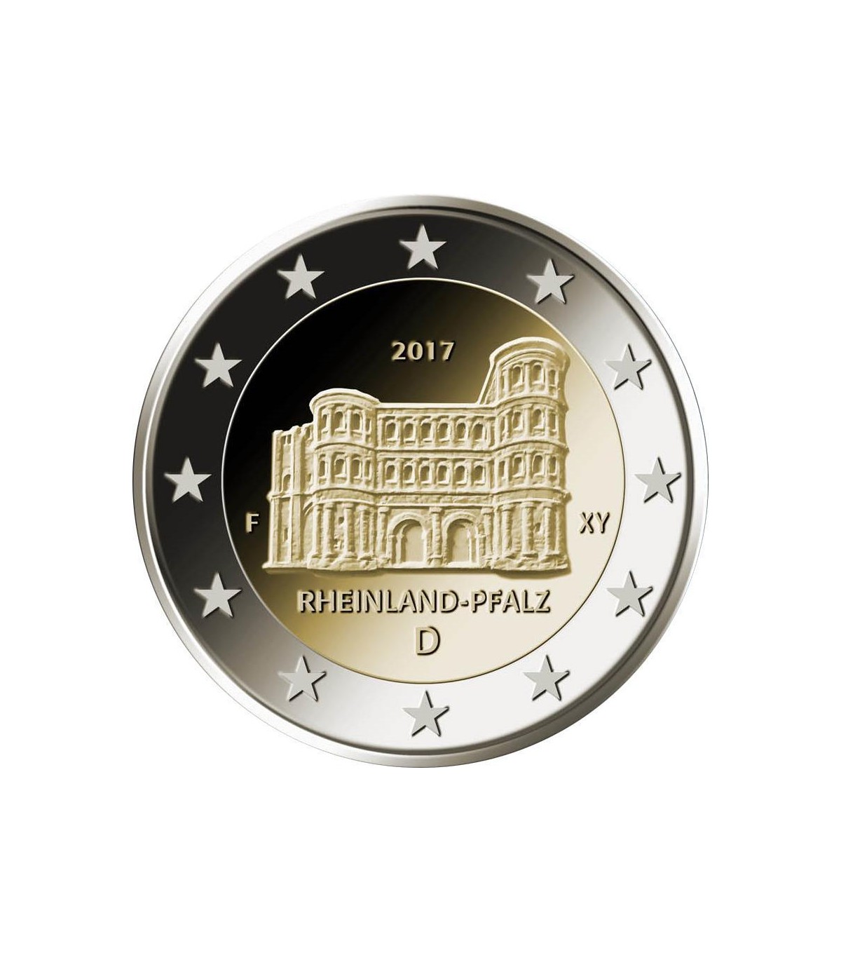 Moneda conmemorativa de 2 euros Alemania 2017 que representa la Porta Nigra en Tréveris en la región de Renania-Palatinado .
