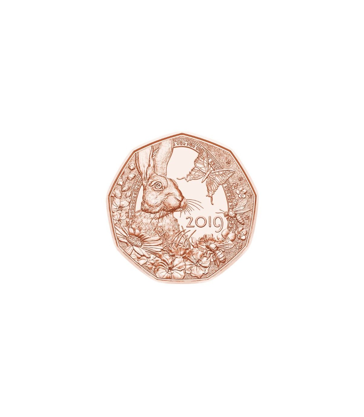 La parte interior de la moneda muestra una liebre que simboliza la fertilidad, con numerosas flores y abejas que enmarcan un huevo de Pascua. Los diversos símbolos de la primavera recuerdan el tema de esta moneda, "Pascua y el despertar de la primavera", con el efecto de una explosión de actividad.