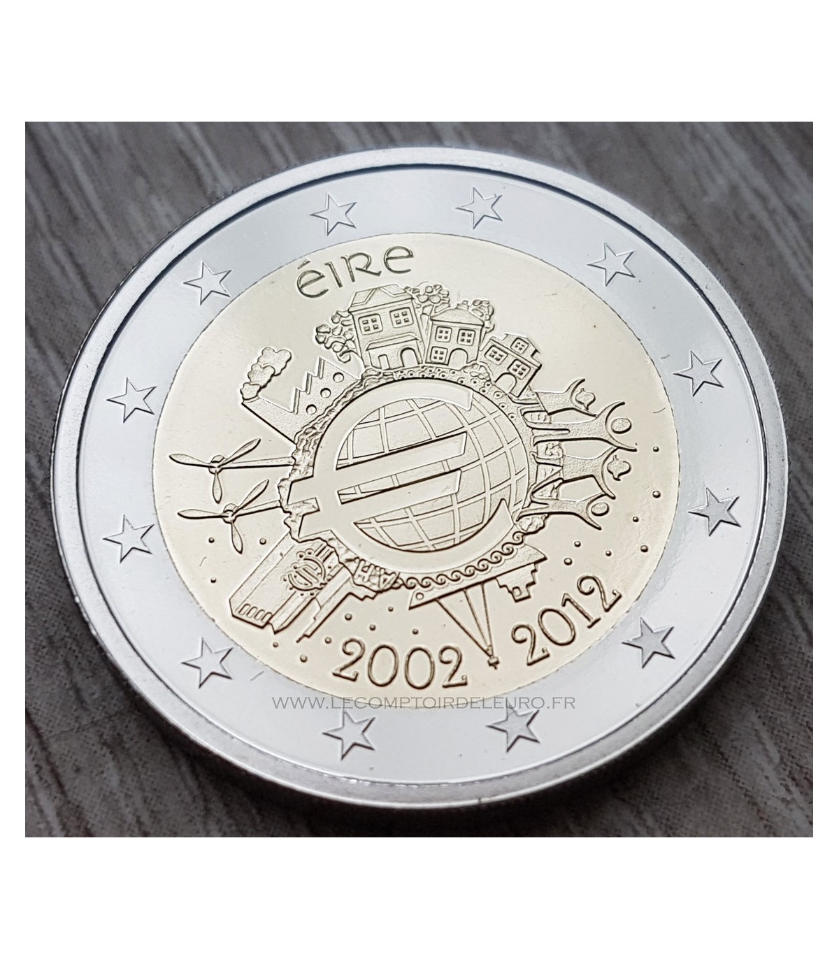 Estuche BE Irlande 2012 compuesto por 9 monedas que combinan las 8 monedas de 1 céntimo a 2 € + la conmemorativa de 2 € "10 años del euro"