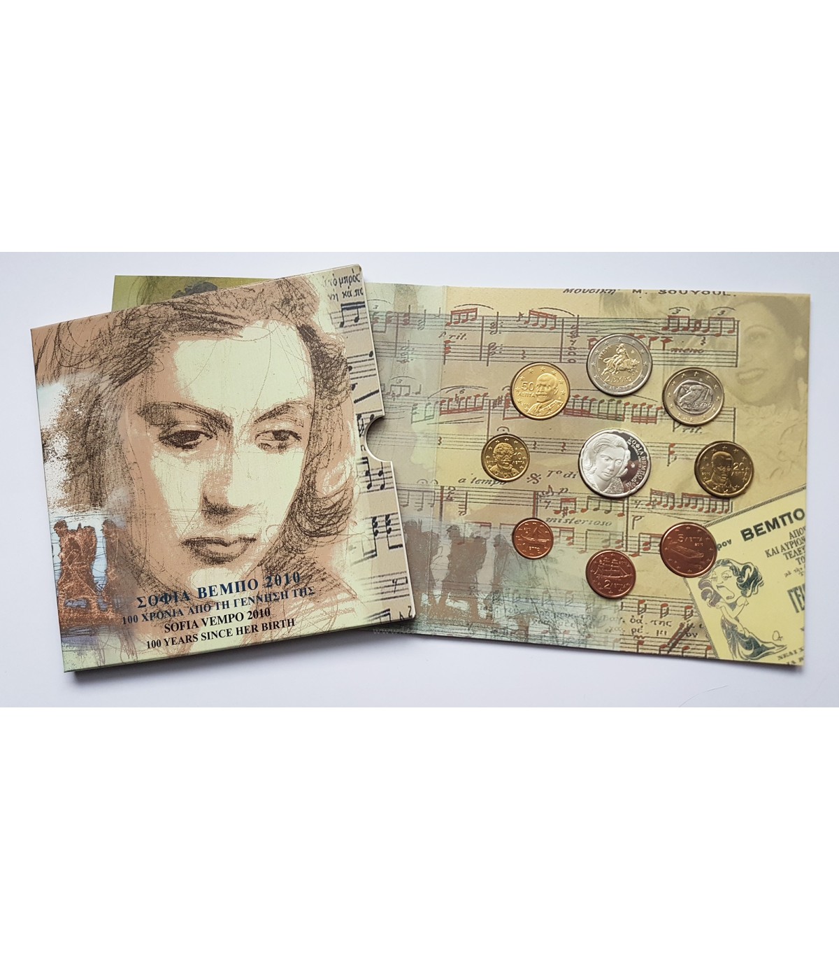 Estuche BU para 2010 que incluye una serie de 8 monedas circulantes de 1 céntimo a 2 euros Grecia + una moneda de calidad Belle Epreuve de 10 euros sobre el tema del centenario de Sophia Vempo.