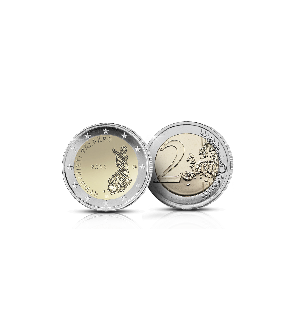 Por último, alrededor del borde exterior de la moneda, hay grabada una leyenda en finés y sueco: "HYVINVOINTI VÄLFÄRD". Esta frase significa "Bienestar" en finés y sueco, las dos lenguas oficiales de Finlandia. Reafirma el compromiso del país con el bienestar de sus ciudadanos y su determinación de mantenerlo para las generaciones venideras.