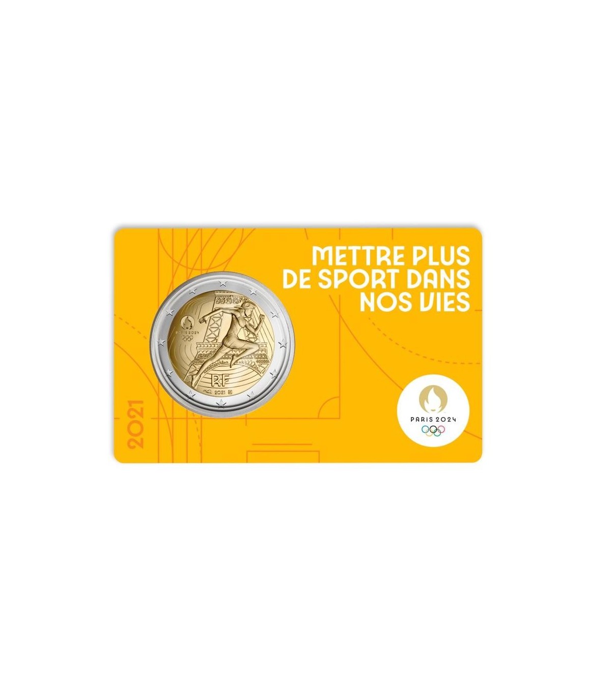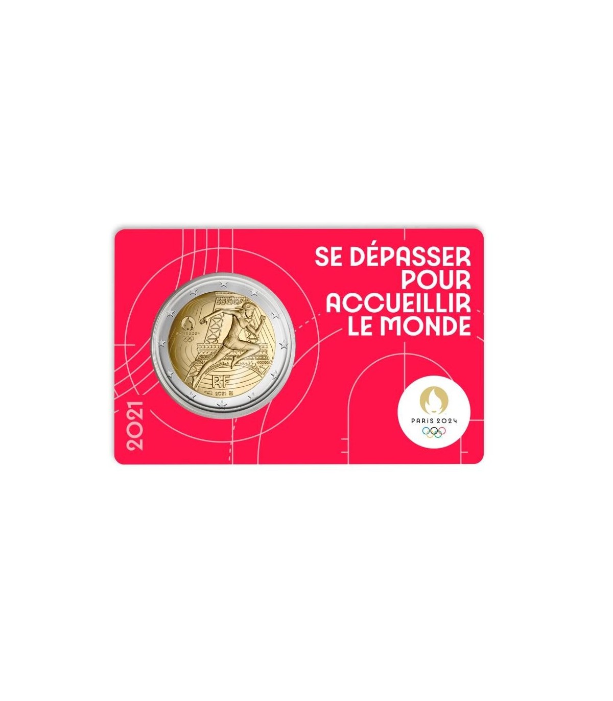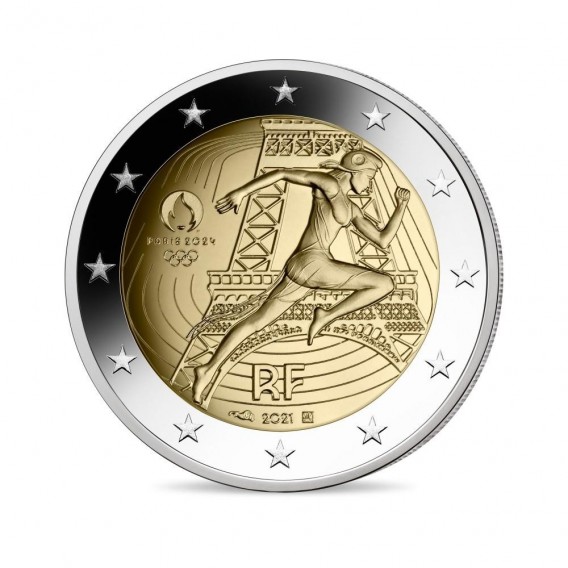 Los Juegos Olímpicos de verano que se celebrarán en París en 2024 están representados por esta moneda . El año 2021 marca oficialmente el inicio de la cuenta atrás para los Juegos de París. La entrega de la bandera olímpica en la ceremonia de clausura de los Juegos anteriores marca el inicio de una nueva era de Juegos en Francia. Esta entrega se representará en la serie. 2021 es también el primer año de una cuadrilogía en la que se pondrá de relieve el deporte y sus valores. Para marcar la cuenta atrás hacia el lanzamiento de los Juegos, la Monnaie de París emitirá una moneda conmemorativa de 2 euros durante cuatro años a partir de 2021. Los diferentes colores representan los anillos de los Juegos Olímpicos