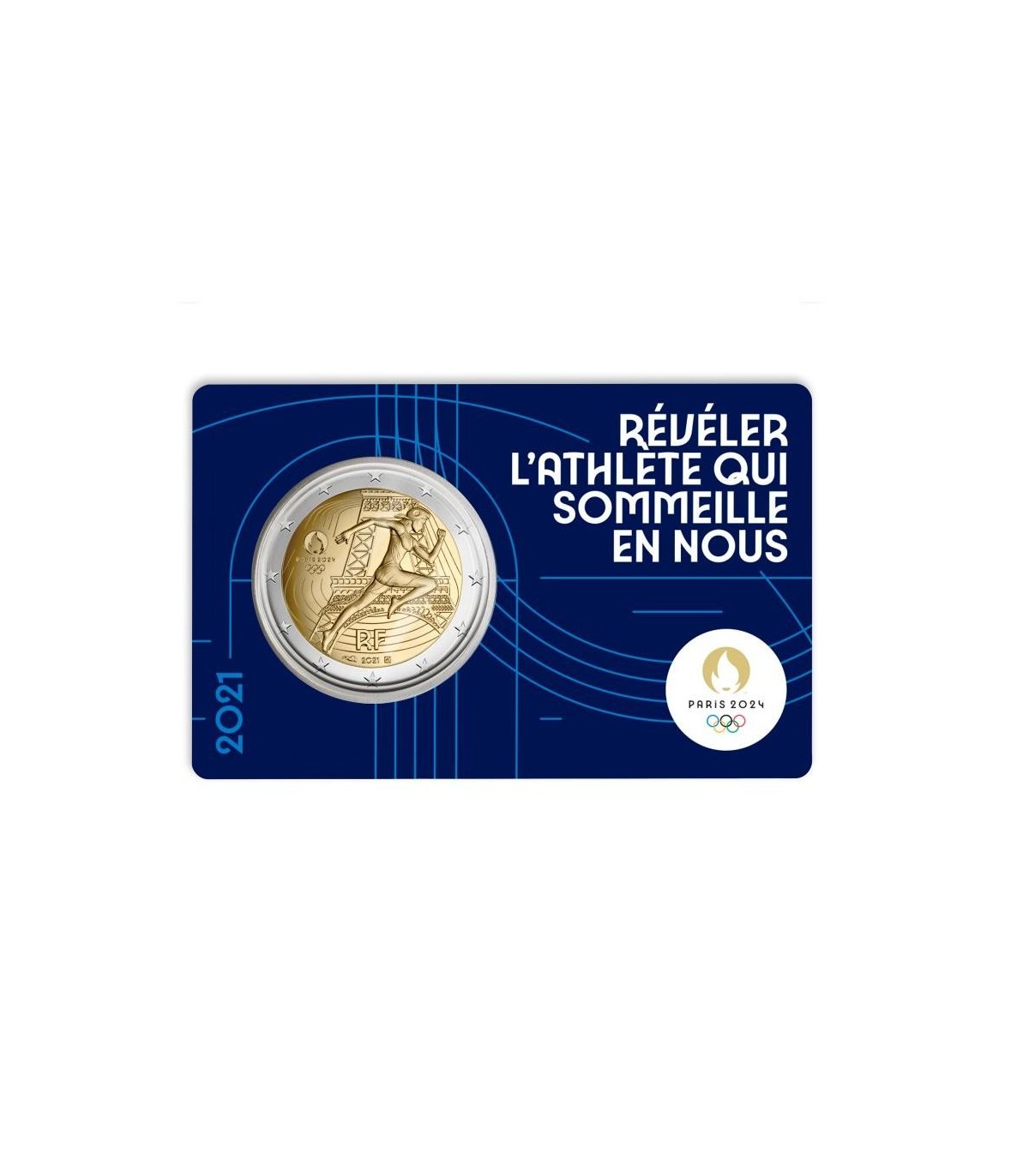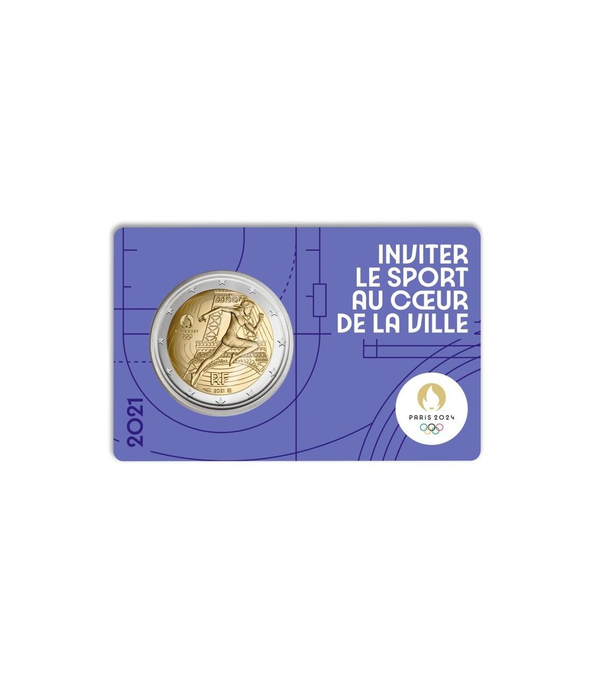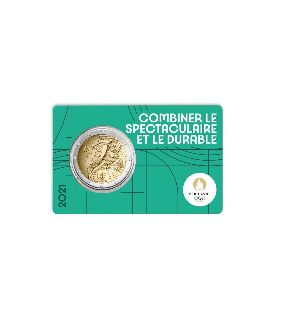 Los Juegos Olímpicos de verano que se celebrarán en París en 2024 están representados por esta moneda . El año 2021 marca oficialmente el inicio de la cuenta atrás para los Juegos de París. La entrega de la bandera olímpica en la ceremonia de clausura de los Juegos anteriores marca el inicio de una nueva era de Juegos en Francia. Esta entrega se representará en la serie. 2021 es también el primer año de una cuadrilogía en la que se pondrá de relieve el deporte y sus valores. Para marcar la cuenta atrás hacia el lanzamiento de los Juegos, la Monnaie de París emitirá una moneda conmemorativa de 2 euros durante cuatro años a partir de 2021. Los diferentes colores representan los anillos de los Juegos Olímpicos
