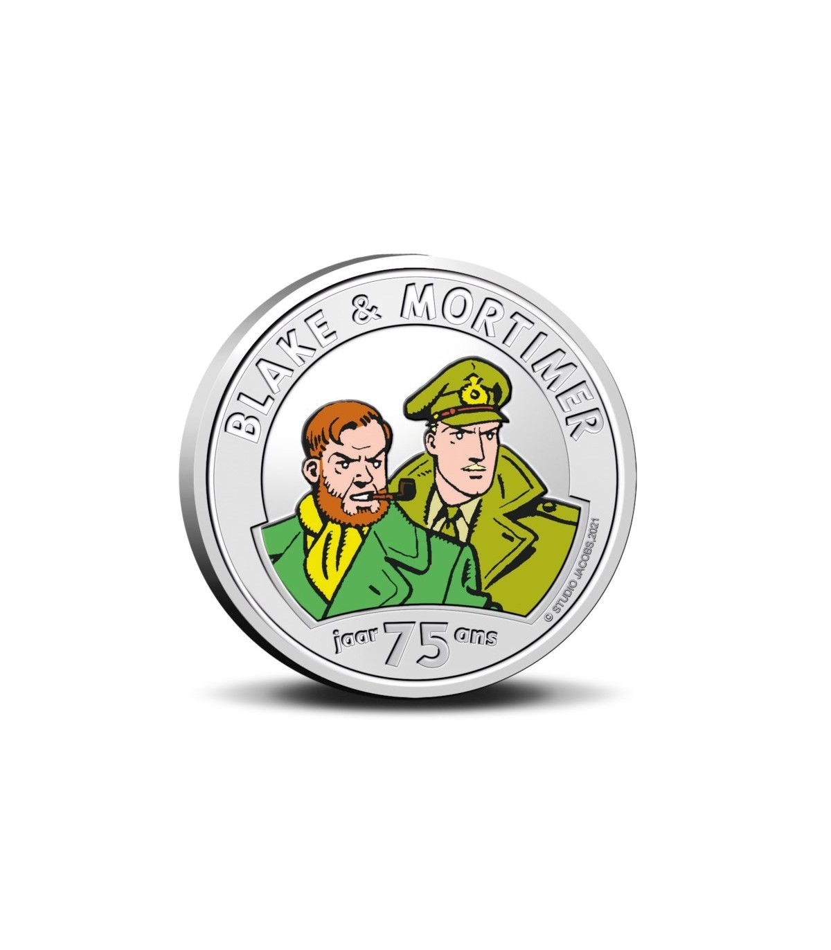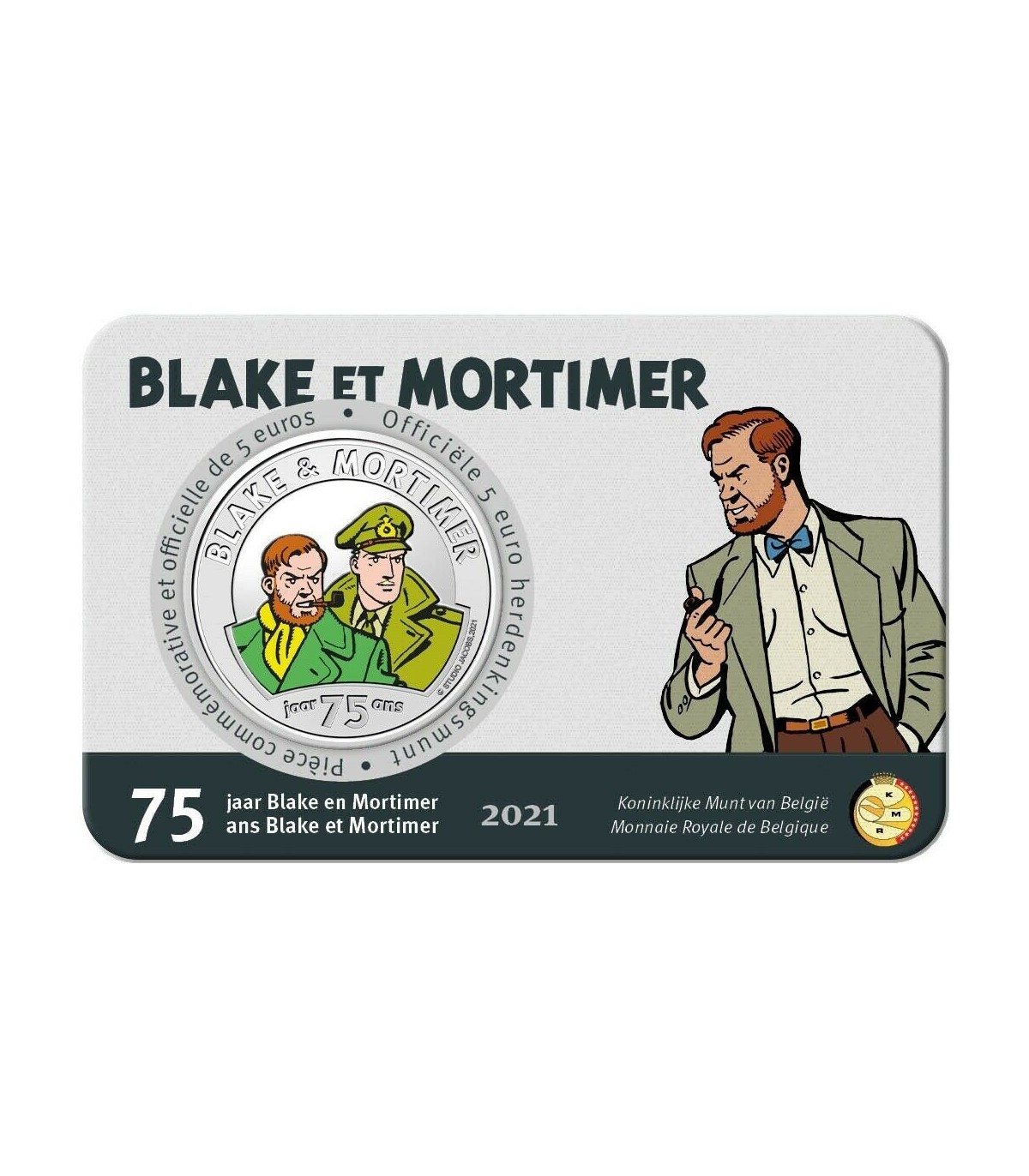 Tarjeta de 5 Euros Bélgica 2021 en versión coloreada sobre el tema del 75 aniversario de la creación de los personajes Blake y Mortimer