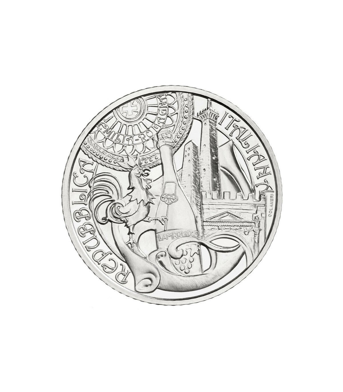 En el anverso de la moneda, dentro de un tortellino, aparecen una botella de Lambrusco, las dos torres Garisenda y Asinelli de Bolonia y un gallo, elemento decorativo típico de la Caveja, símbolo de Romaña. En la parte superior, destacan el rosetón de la catedral de Módena y la palabra Emilia-Romaña.