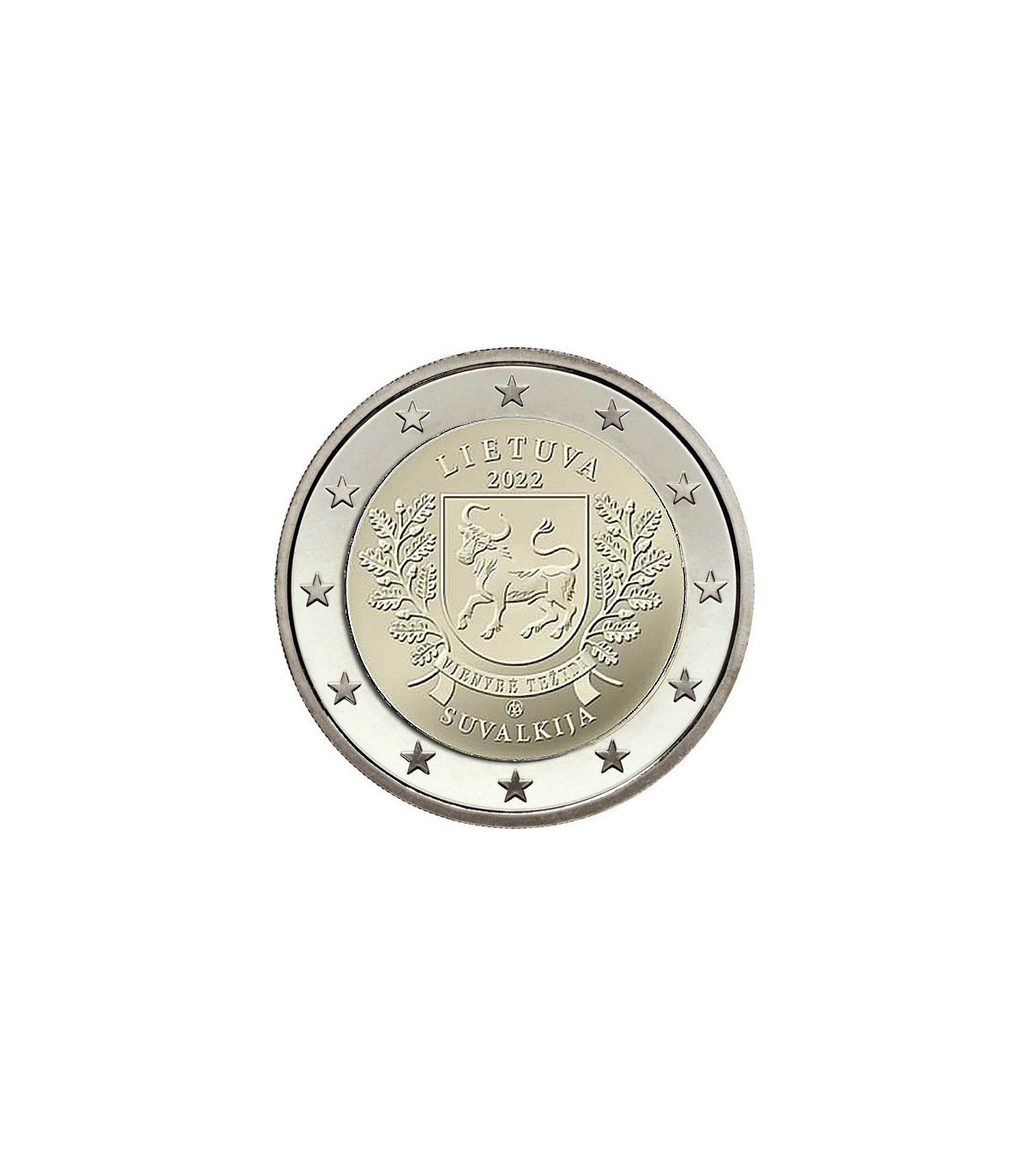 En la cara nacional de la moneda figura un toro en el escudo de armas, el escudo está decorado a ambos lados con ramas de roble plateadas con bellotas, unidas en la parte inferior por una cinta plateada con la inscripción "Vienybė težydi" . Las ramas de roble simbolizan la profunda historia de la región, recordando los tiempos paganos del Estado lituano. El toro fue antaño el animal más común de la región. En la parte superior de la composición figura la inscripción "Lietua", el año de emisión de la moneda es 2022, en la parte inferior - el logotipo de "Suvalkija" y el fabricante de monedas de la UAB "Lietuvos monetų kalykla", 12 estrellas de la UE están dispuestas en un círculo.