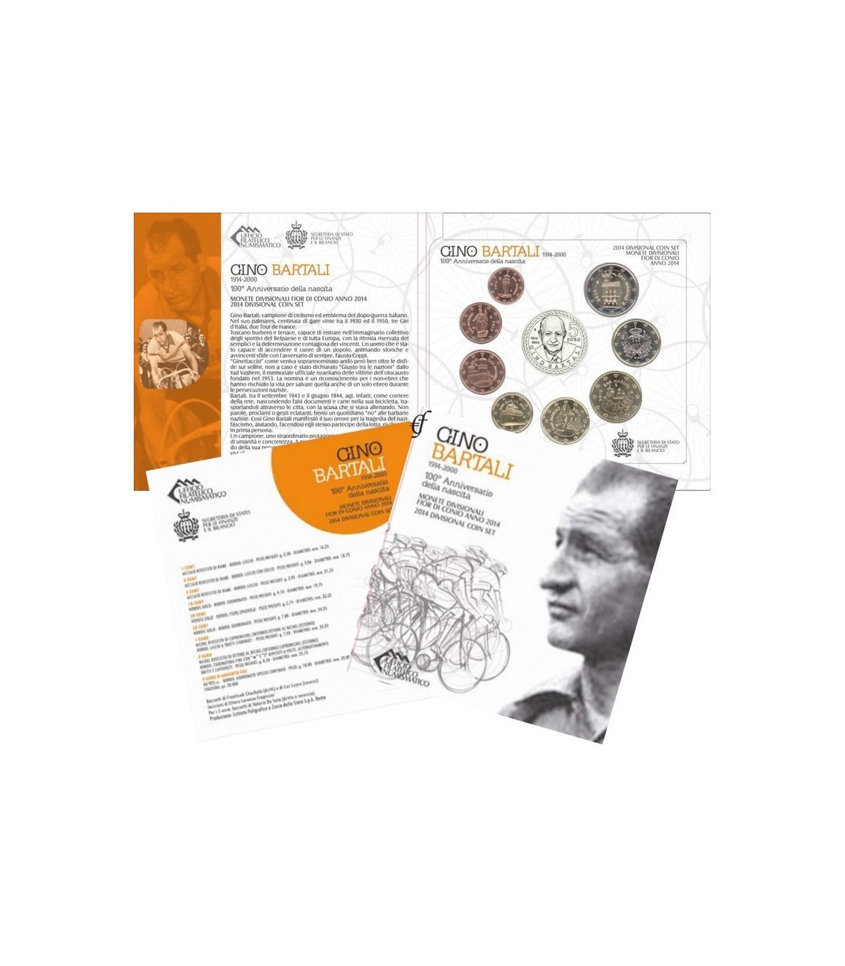 coffret de 9 pièces réunissant les pièces de la 1 cent à 2 euros de l’année 2014 + 1 pièce commémorative de 5 € en argent commémorant le 100e anniversaire de la naissance de Gino Bartali.