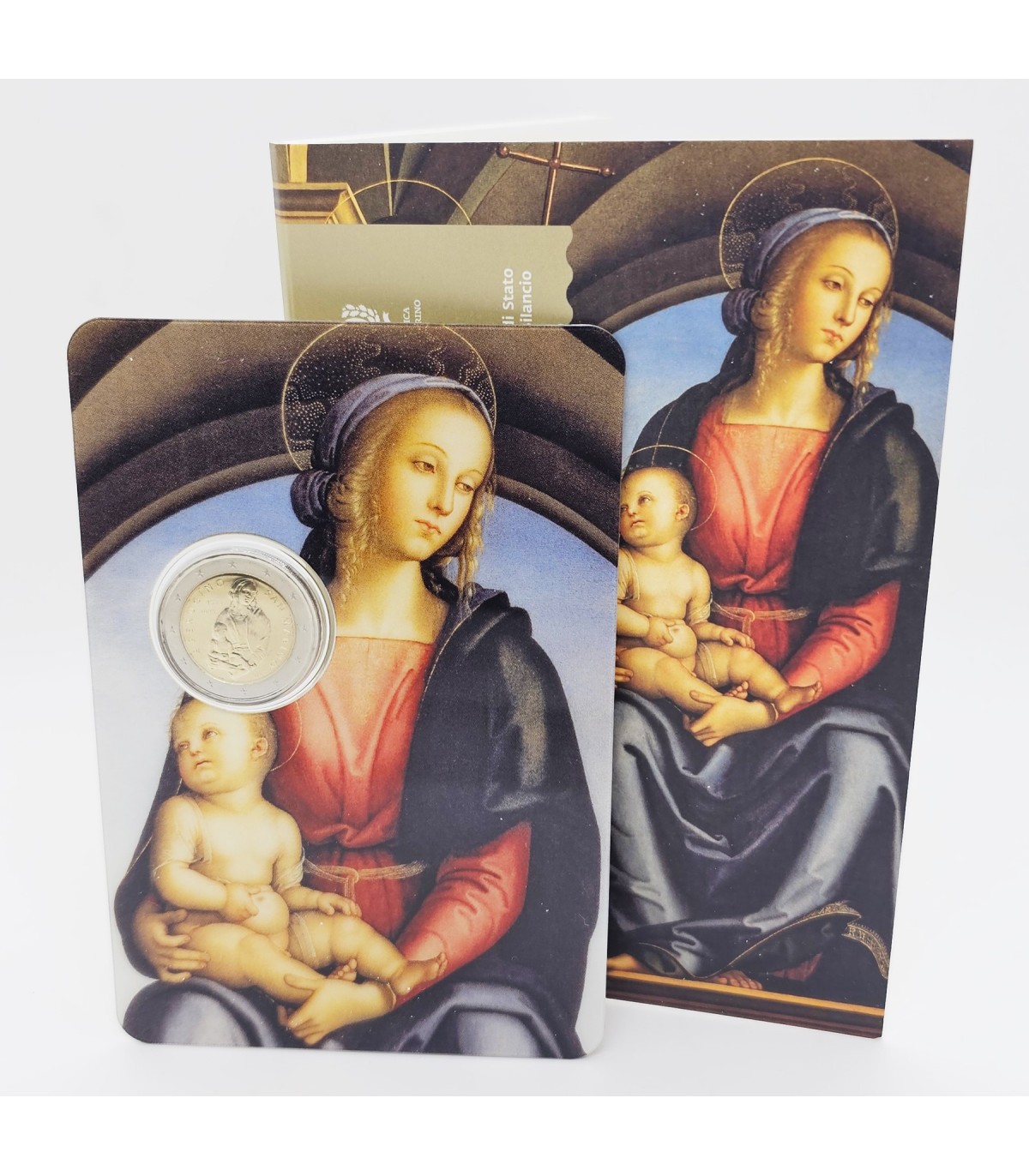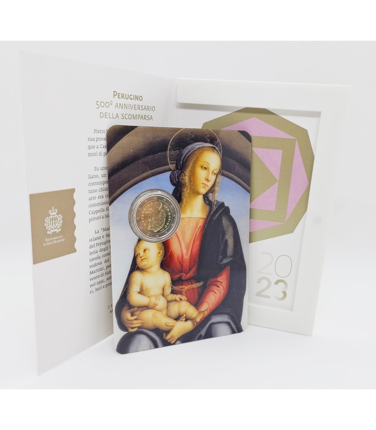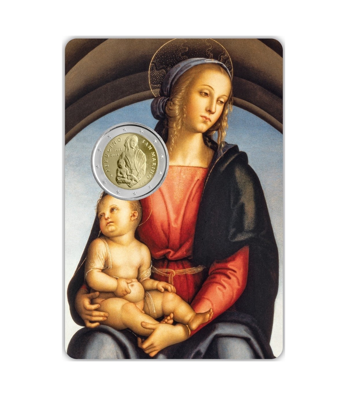 En la cara nacional se representa en el centro a la Virgen María con el Niño Jesús, detalle del cuadro Virgen con el Niño, San Sebastián y San Juan Bautista, de Pietro Vannucci, conservado en las Galerías Uffizi de Florencia. La inscripción PERUGINO, las fechas 1523 (fecha de la muerte del artista) y 2023 (año de emisión) y debajo la letra R, que identifica el taller de Roma, completan la pieza de la izquierda. A la derecha, alrededor, la inscripción SAN MARINO y debajo las iniciales de la autora Maria Angela Cassol , MAC.