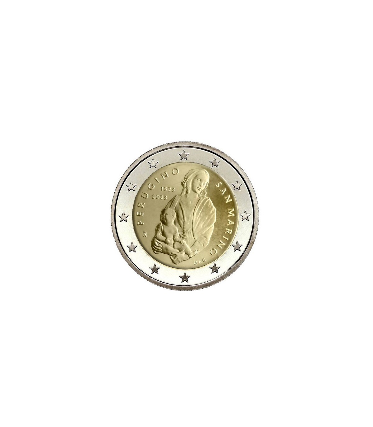 Moneda conmemorativa de 2 euros de San Marino 2023 con motivo del 500 aniversario de la muerte de Perugino, también conocido como Pietro Vannucci, pintor italiano del Renacimiento.
