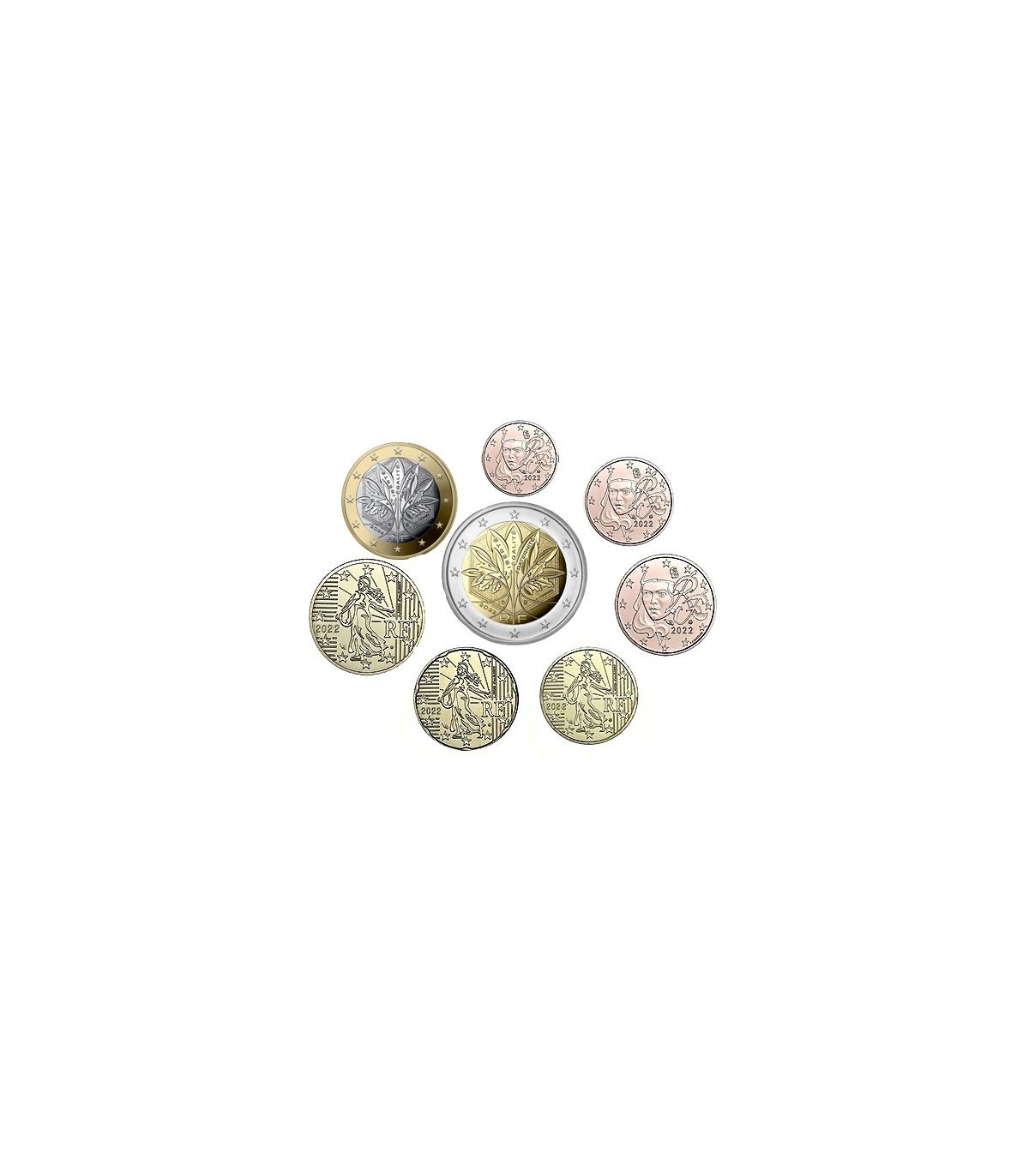 Serie Francia 2022 con las 8 monedas de la serie Francia de 1 céntimo a 2 euros para el año 2022.