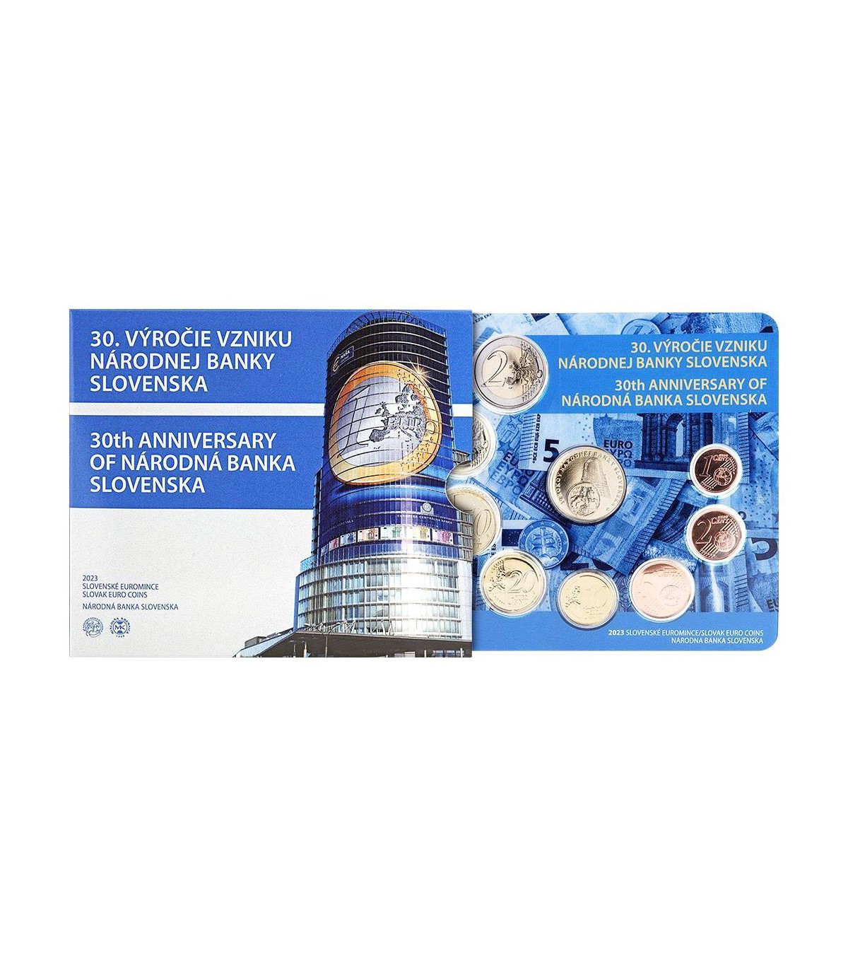 Estuche universal brillante Eslovaquia que contiene las monedas de 1 céntimo a 2 euros del año 2023 y una medalla de cuproníquel sobre los 30 años del Banco Nacional de Eslovaquia