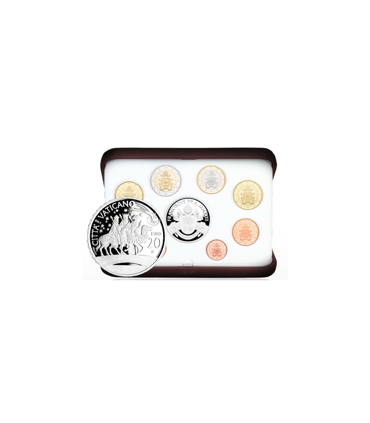 Esta serie consta de monedas de 1 céntimo a 2 euros para el año 2023 con el escudo del Papa Francisco I (escudo) + una moneda de plata de 20 euros con el tema de los Reyes Magos.