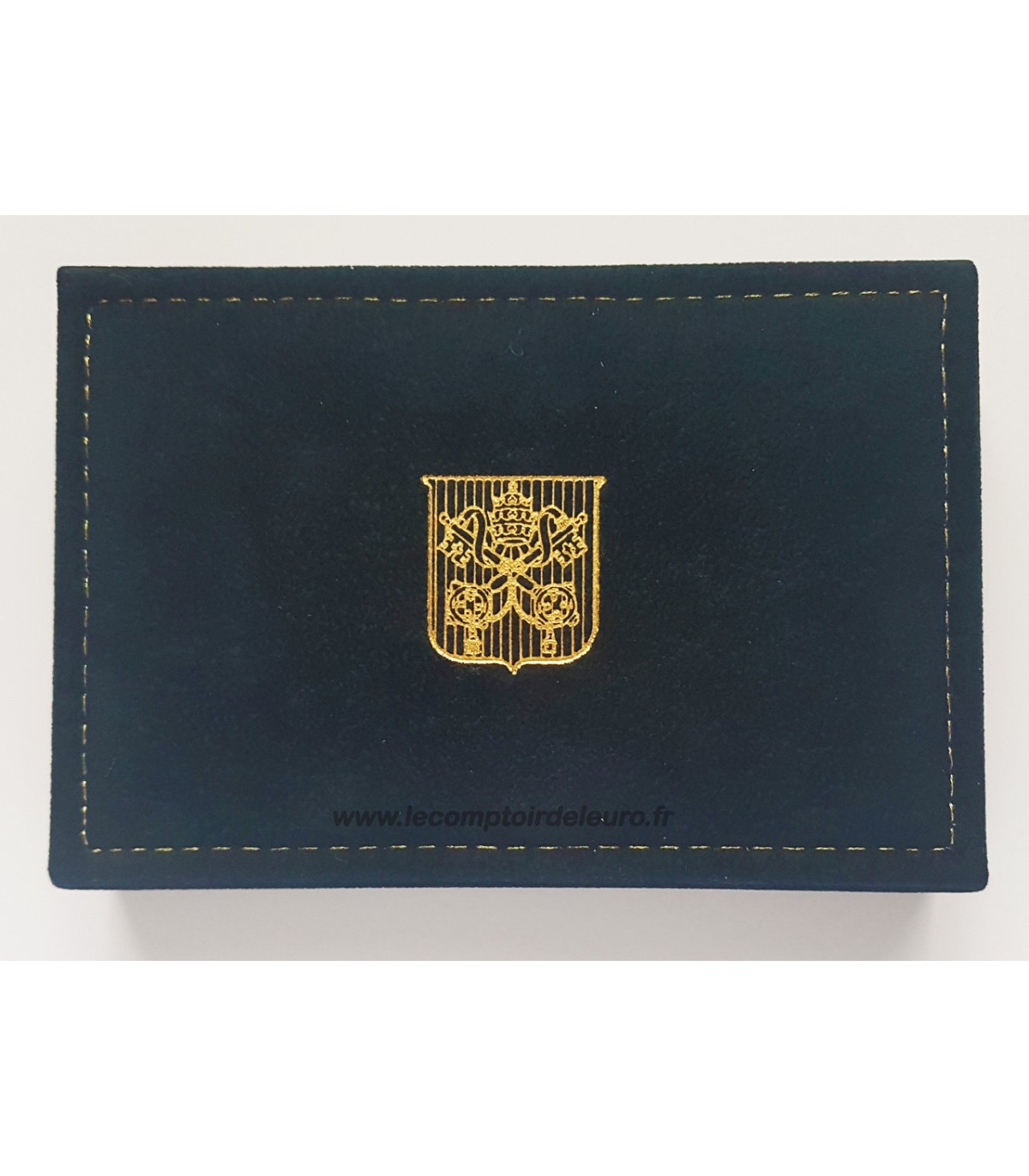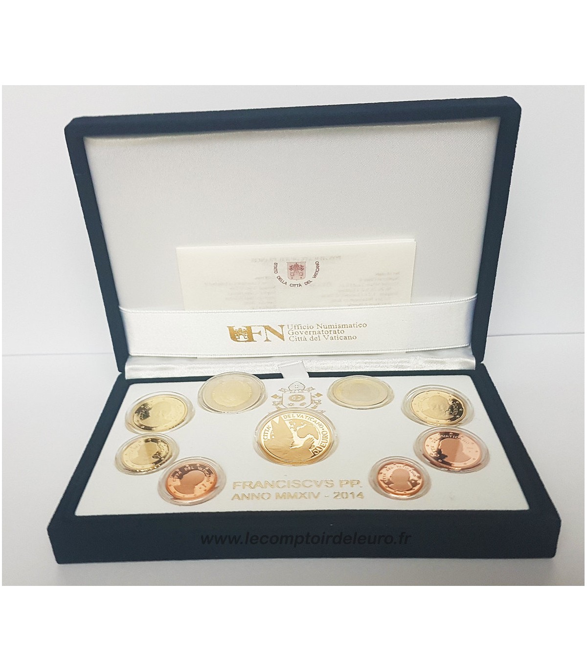 Serie en estuche oficial BE 2014 de Francisco I que contiene 8 monedas de 1c a 2 euros de la cosecha 2014 con la efigie del Papa Francisco I en calidad encapsulada Belle Epreuve y una moneda de oro conmemorativa de 50 euros con el tema de la canonización del Papa Juan Pablo II. Este conjunto incluye la serie oficial BE con la efigie del Papa Benedicto XVI en una edición de 2.000 ejemplares numerados. - Las monedas de 8 euros de 1 céntimo a 2 euros representan la efigie del Papa Francisco I. Todas las monedas llevan la inscripción CITA DEL VATICANO y el año, así como las doce estrellas de la Unión Europea.