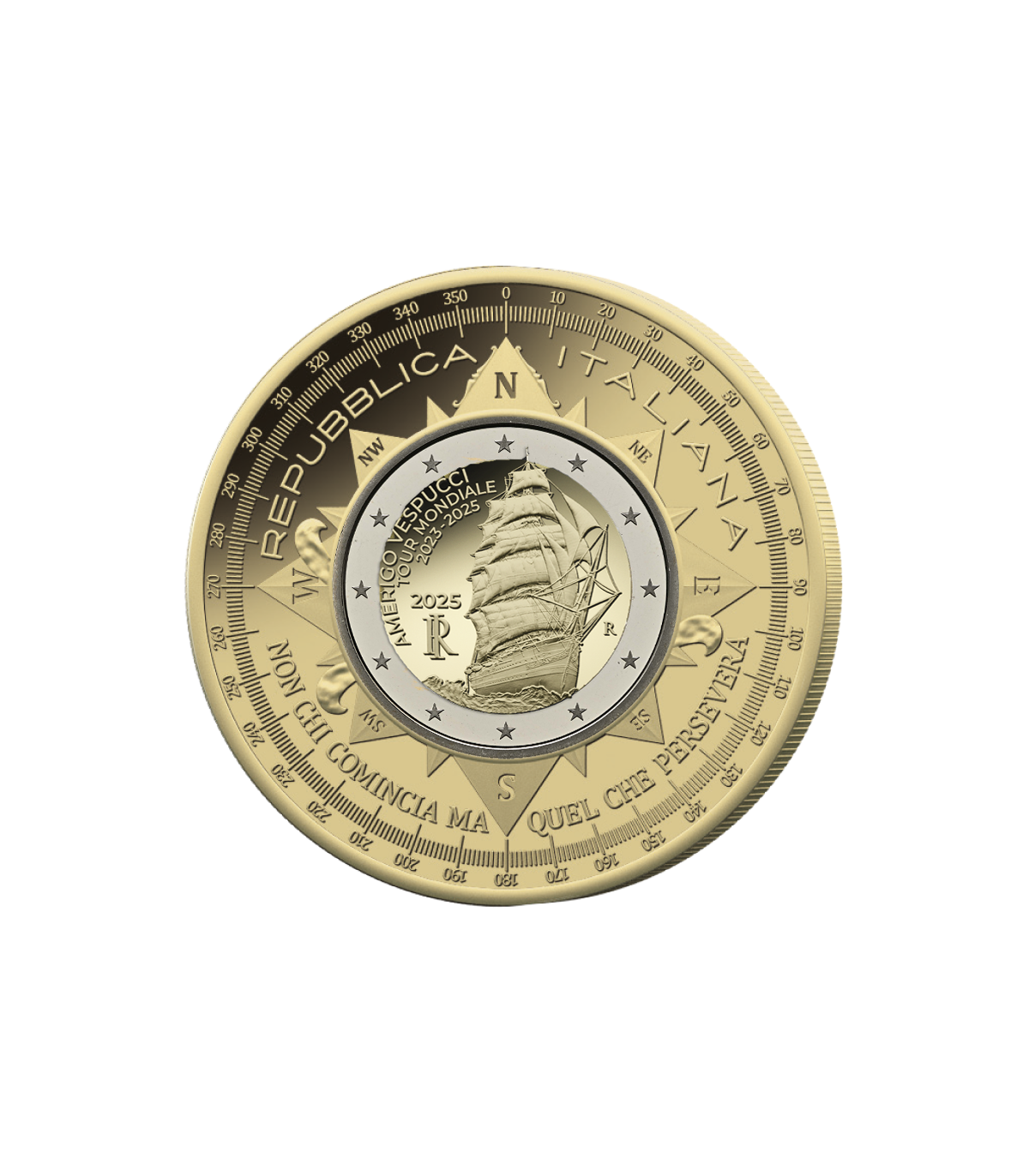 L’avers de la pièce de 10 euros présente une boussole stylisée avec les points cardinaux entourant l’ouverture centrale. Des graduations en degrés viennent souligner le thème de la navigation. L’inscription « Repubblica Italiana » figure en haut, tandis qu’en bas apparaît la devise du voilier : « Non chi comincia ma quel che persevera ».