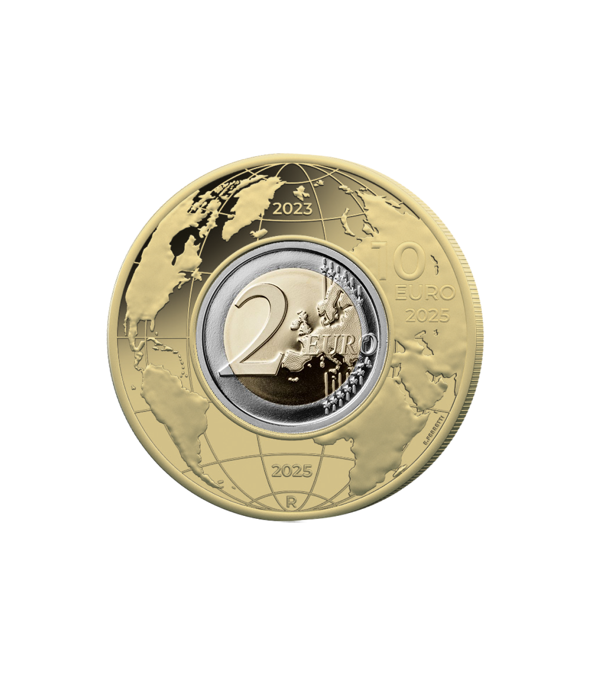 Le revers met en scène un globe terrestre orné de parallèles et de méridiens, symbolisant le périple autour du monde. Les dates « 2023 » et « 2025 » rappellent le début et la fin de cette mission internationale. Sont également visibles la valeur faciale, le « R » de la Monnaie de Rome et la signature de l’artiste, E. Ferretti.
