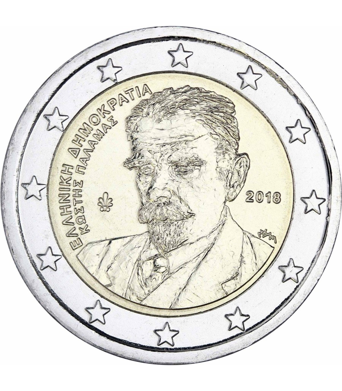 Description du dessin: Le dessin représente un portrait du poète grec Kostis Palamas (1859-1943). L’inscription «RÉPUBLIQUE HELLÉNIQUE» et le nom «KOSTIS PALAMAS» figurent le long du bord intérieur à gauche (en grec). Figurent également sur la pièce une palmette (la marque d’atelier de la Monnaie grecque) et l’année d’émission «2018». Dans la partie inférieure droite, on peut voir le monogramme de l’artiste (George Stamatopoulos).