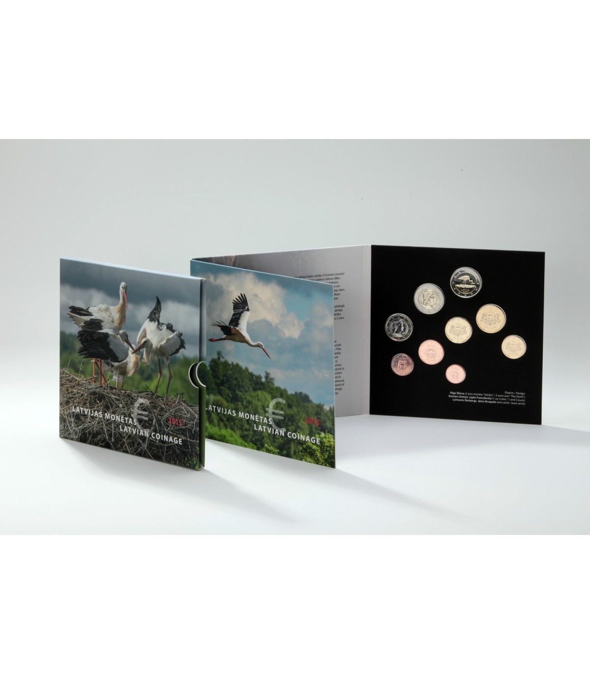 Cofanetto fdc 2015 comprendente una serie di 8 monete che raggruppano i tagli da 1 centesimo a 2 euro della Lettonia + 2 euro commemorativo 2015 sul tema "La cicogna".