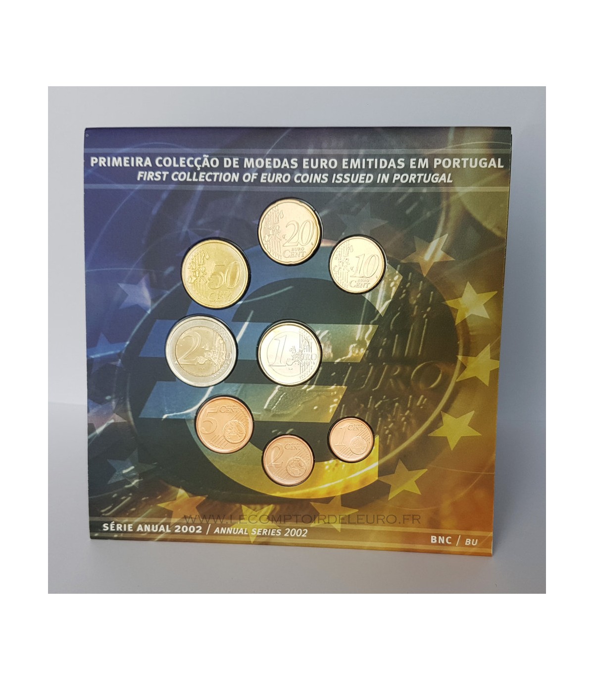 Serie annuale in cofanetto di 8 monete del Portogallo da 1 centesimo a 2 euro per il 2002 in qualità universale lucida.