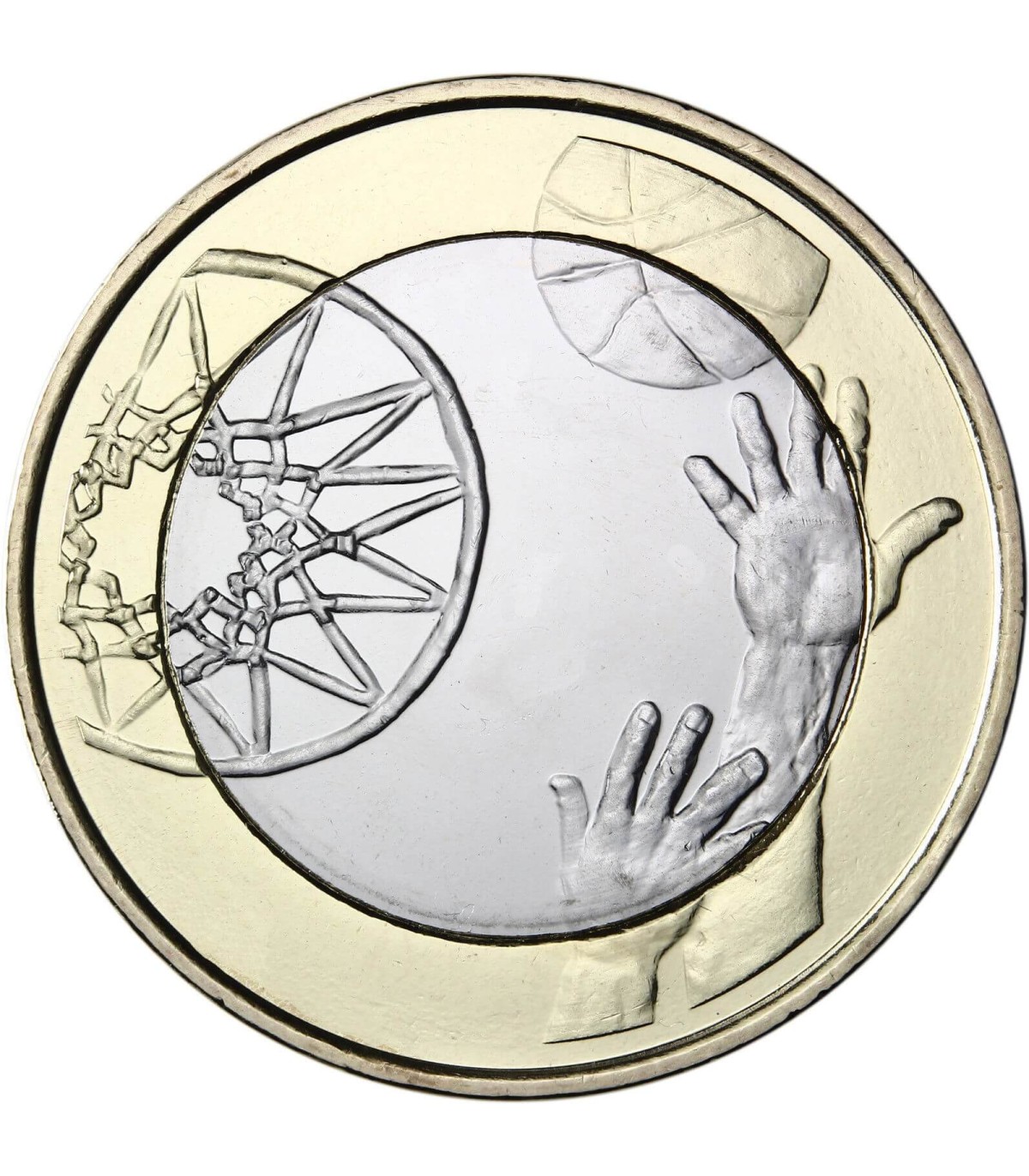 Moneta commemorativa da 5 Euro Finlandia 2015 sul tema del basket.Moneta in nichel cupro.