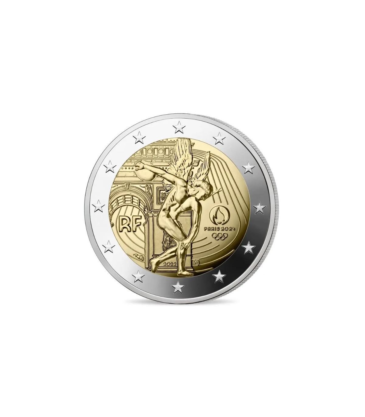 La moneta raffigura il Genio che lancia un disco, affacciandosi sullo stadio di atletica dei Giochi. Sullo sfondo è presente anche l'Arco di Trionfo, simbolo della città di Parigi.