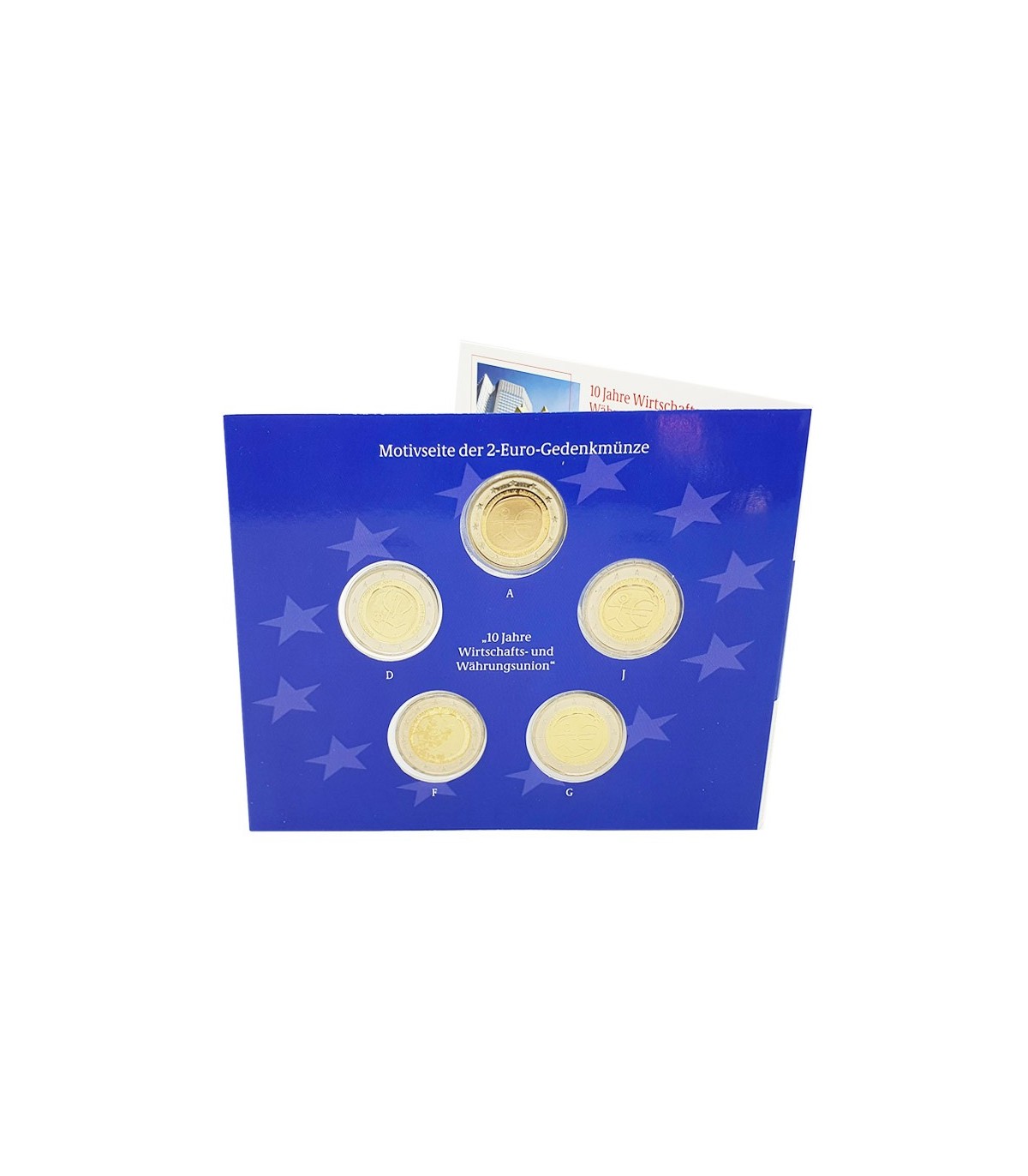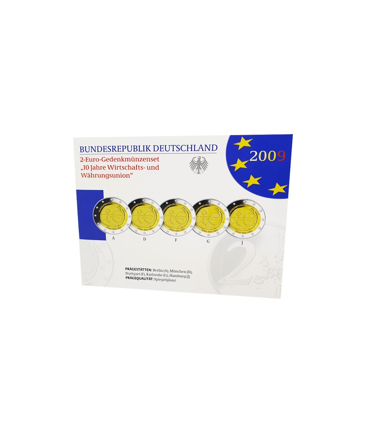 Il1° gennaio tutti i Paesi della zona euro hanno emesso una moneta commemorativa da 2 euro per celebrare il 10° anniversario dell'unione monetaria. Al centro della moneta è raffigurata una figura umana stilizzata il cui braccio sinistro è allungato dal simbolo dell'euro. Le iniziali dell'artista ΓΣ appaiono sotto il simbolo dell'euro. Il nome del Paese di emissione appare nella lingua nazionale nella parte superiore, mentre l'indicazione 1999-2009 e l'acronimo UEM tradotto nella lingua nazionale compaiono nella parte inferiore. L'anello esterno della moneta rappresenta le dodici stelle della bandiera europea.