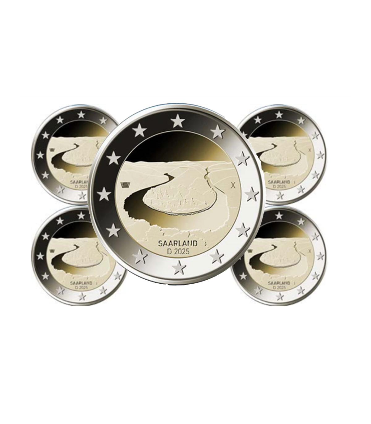 La moneta commemorativa da 2 euro del 2025, disegnata dall'artista Carsten Wolff, mette in evidenza il "Saar Loop". Il design pulito cattura il corso tortuoso del fiume Saar, che si snoda attraverso un paesaggio collinare e boscoso. La vista aerea dell'ansa della Saar illustra questo corso d'acqua naturale incorniciato da colline lontane.