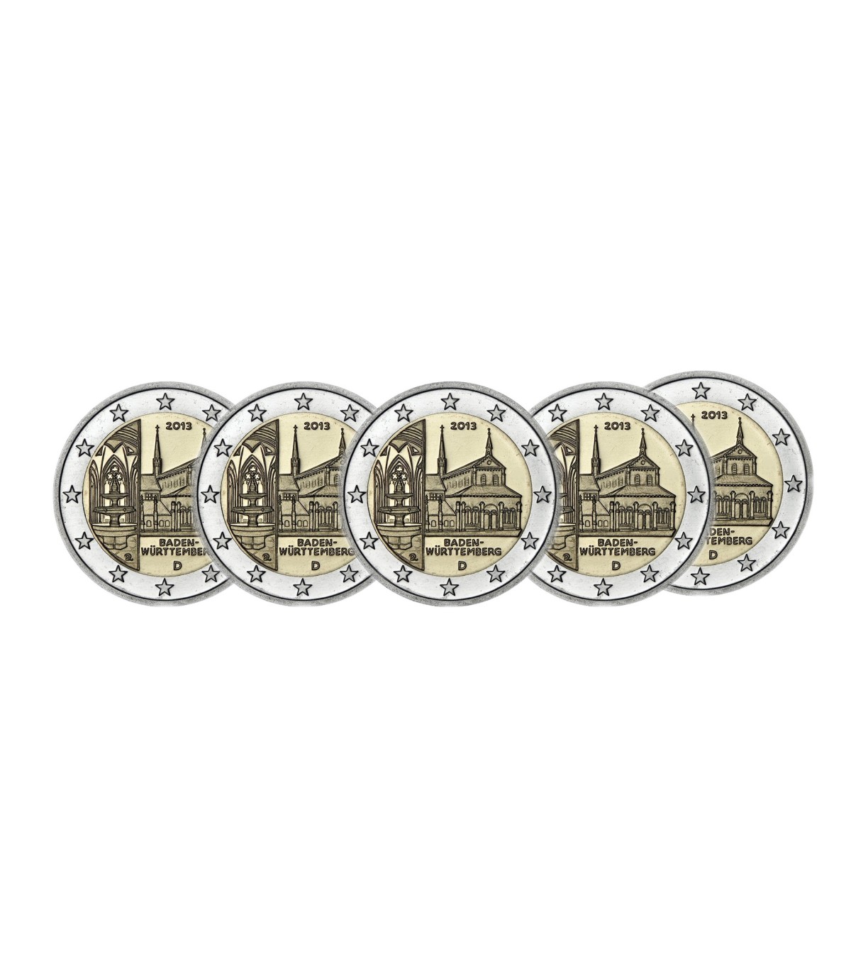 Tema:Lotto di 5 monete commemorative da 2 euro Germania 2013 di diverse officine (A,D,F,G,J) raffiguranti il monastero cistercense di Maulbronn nel Baden-Württemberg.