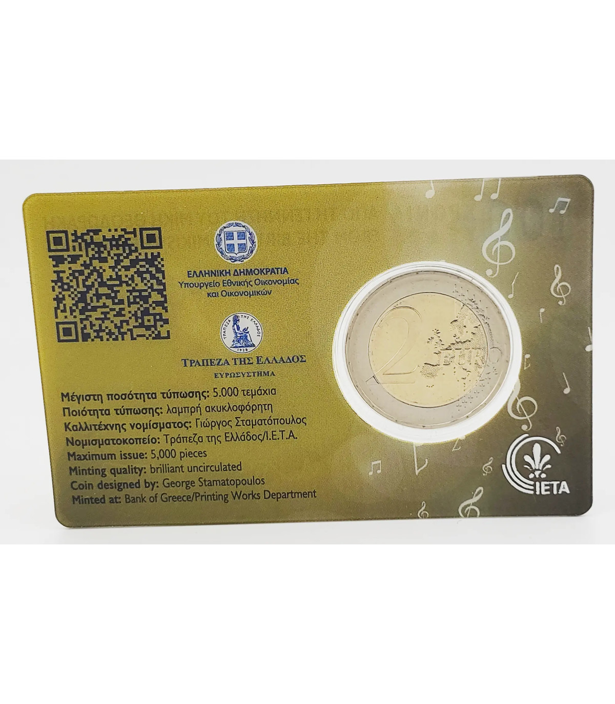Nel 2025 la Grecia emetterà una moneta commemorativa da 2 euro UNC per celebrare il 100ᵉ anniversario della nascita di Mikis Theodorakis (1925-2021), compositore di fama mondiale e figura politica di spicco.